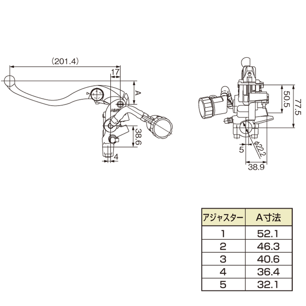 カラー:ブラックボディ/ブラックレバーピストンサイズ:Φ19(横型14mm相当)適合ハンドル:Φ22.2mmレバーアジャストは5段階調整可能。適合ハンドル径22.2mm。バンジョーサイズ:M10×P1.25。取付可能ミラーボルトサイズ:M10×P1.25。※定期的(2年毎)なフルード交換を行なってください。