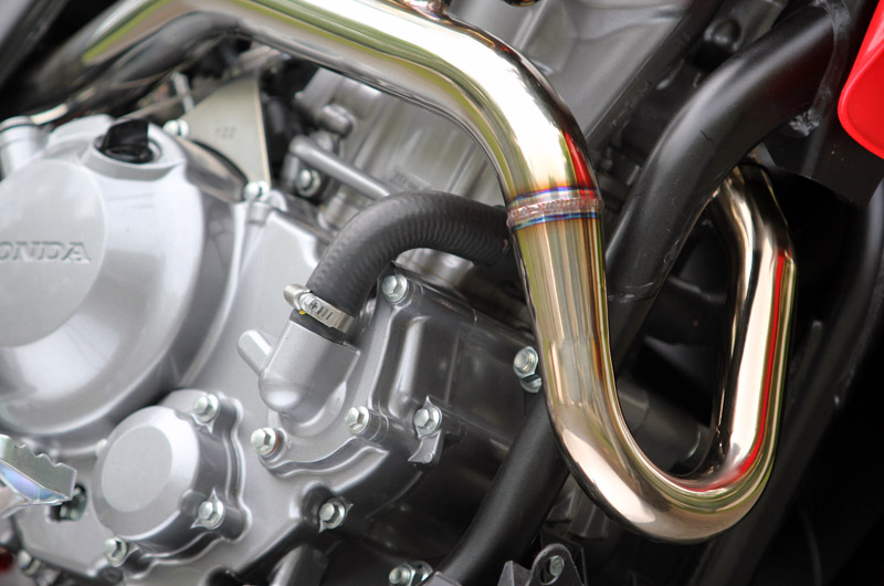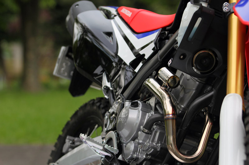 外観からは変化に気がつかない、でも走り出した瞬間 笑顔になるパイプを徐々に変化させた太さと長さで絶妙な特性を引き出したクラッチを繋ぐと、トゥルルルって上質なパルス感が全身を喜ばせるこのパイプのおかげだ手間暇かけてBOXの容積、取付位置を変えながら綺麗なパワーラインを探り出した早め早めにギアアップできる気持ちイーゆたかなトルクはこのBoxの仕事旅に出たならTOPギアを選択したままどこまでもどこまでも走り続けるそんなことを思いながら沢山の時間と沢山の手間と愛情を注ぎ込んでこの一本のパイプを創りました結構いい出来です。CRF250RALLY を操るあなたのことを一生懸命考えながらRALLY がもっと気持ちイー!存在になるために素材:超軽量ステンレスエキゾーストパイプ ポリッシュ仕上げドレンボルト◯/フィルター◯MADE IN JAPANこの製品は公道走行可能です(適用車種へ装着の場合に限ります)