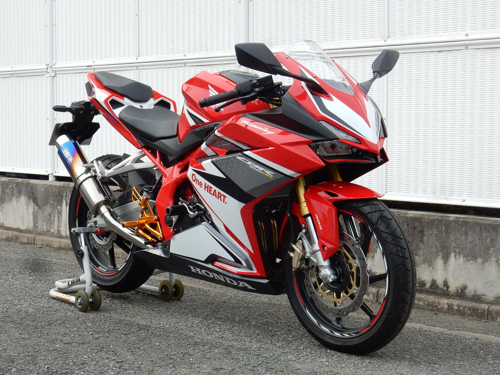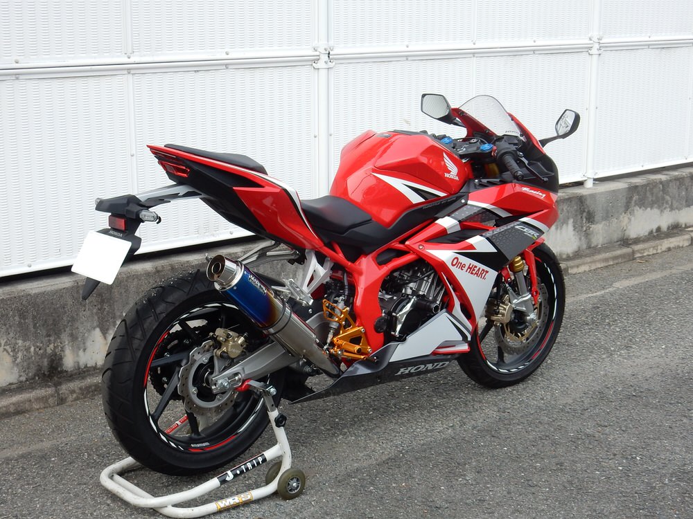 CBR250RRの高スペックエンジンを余す事無く引き出したフルエキゾーストです。(燃調はノーマルのままのポン付けです)明らかに違うレスポンス感やパワー感をスリップオンでは無し得ない圧倒的なパワーフィールは、きっと満足頂けるものと思います。特にスタートからの加速感、パーシャル(一定)状態からのアクセルを開けた時の加速感は、どのモードスイッチからでも俊敏に反応してくれ、特に「sport+」モードにおいては、ノーマルマフラーでは加速後にアクセルをオフにすると強烈なエンジンブレーキがかかり、かなりギクシャク感が感じられますが、このフルエキゾーストにおいては適度な(緩やかな)エンジンブレーキへと変貌。実走テストにおいてCBR250RRユーザーにも乗って頂きましたが、「エンジンブレーキのフィーリングが良くアクセルワークが楽になった」とのインプレを頂いており、そのパワー感とともに乗り手の思い通りのイメージでバイクとの一体感を感じて頂けると思います。音質的にも金属チックな音質からツイン独特のマフラー音になりスリップオンでもそうでしたが、高回転域まで回すほどレーシングサウンドを思わす音質へと変貌、音量はしっかり抑えながらも明らかにスポーティーな音質で重低音の効いた存在感のある音質はCBR250RR本来のサウンドを楽しんで頂けるのではないかと思います。※特にフルエキゾーストになった事で更に重低音の効いたサウンドへと変貌しています。マフラーレイアウトはCBR250RRの特徴でもあるガルアームのスイングアームデザインを活かし、車体に沿う様にマフラーをレイアウト。アグレッシブでスタイリッシュなCBR250RRを更にスポーティーなイメージに仕上げ、レプリカならではのレイアウトに仕立てました。マフラー重量に関してはどのサイレンサータイプを選択してもノーマルマフラーからの重量は半分以下の軽量化になり、見た目の軽快感と共に実際にも取り回しや乗っている時の切り返し等で軽量化をしっかり感じて頂けるのではないかと思います。近接騒音値:93db加速走行騒音:82db触媒装置:内臓モデルオイル交換:OKオイルフィター:OK
