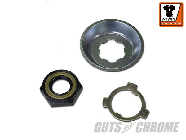 V-TWIN製 デュオシールナット&ディフレクターキット4速トランスミッション メインシャフト スプロケット用シールナット、ロックワッシャー、ディフレクターのキットです。【適合】FL 1941-1984EL 1936-1940UL 1937-1948Made in TAIWAN