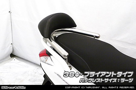 今、ローダウンはスクーターカスタムの定番となっておりますが、そのローフォルムに合わせて出来るだけ車体全体を低く見せるために、車体との一体感を追求したタンデムバーを開発いたしました!車体に沿うように低くデザインされているのでボディラインにフィットし、かつ極太の38mm径のステンレスパイプを採用しましたので、存在感、目立ち度は抜群です!仕上げはバフ掛けを施していますので、高級感タップリでドレスアップには最適の逸品です!バーが極太なので、パッセンジャーが握りやすく力を入れやすいので、安全性も高くなっております。ユーザー様により便利でお手軽に装着して頂くため、大型バックレストをウイルズウィンオリジナルで製作しました。従来の価格より大幅に値下げする事に成功しましたので、よりお求めやすくなりました。オリジナルバックレストは型から興して製作していますので、見た目も良く耐久性に優れるしっかりとした作りになっています。材質は、耐久性、耐腐食性の高いオールステンレス製です。