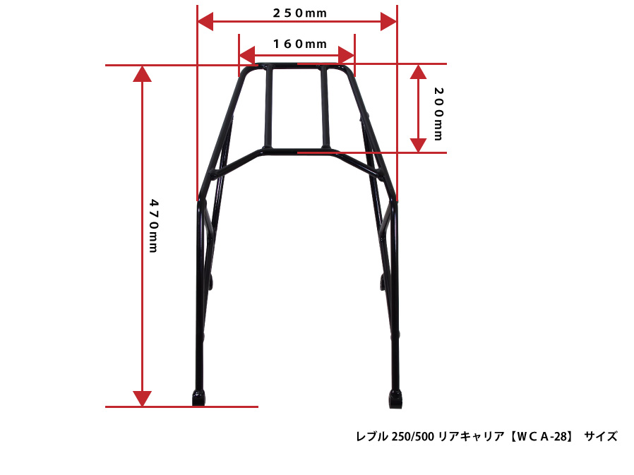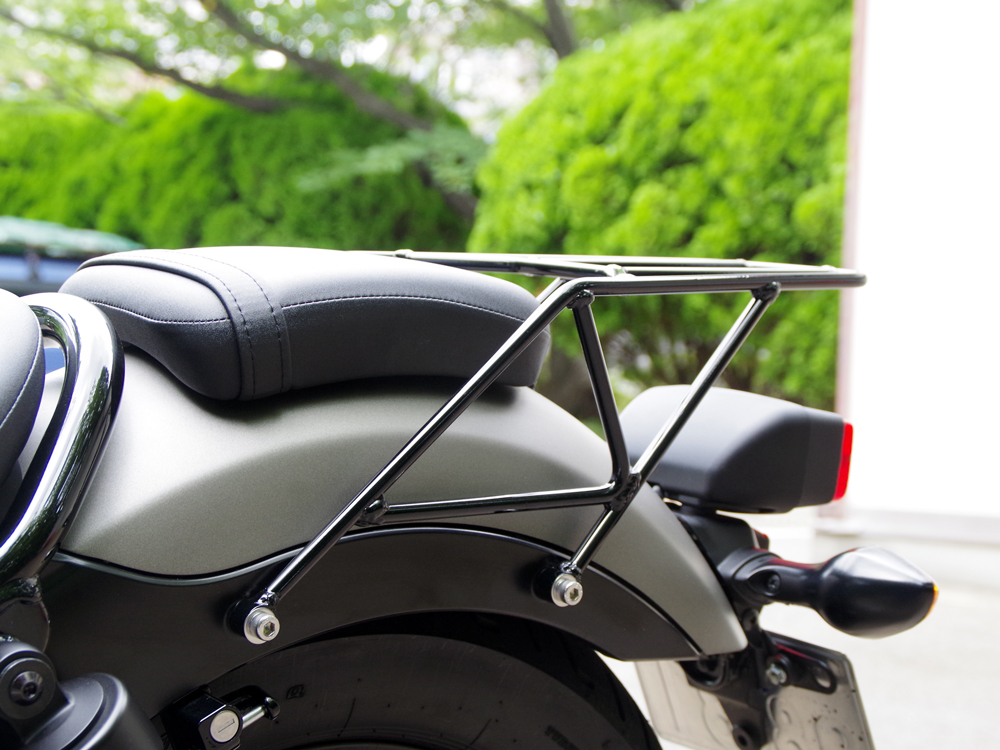 足の部分はトラス構造とし強度を確保しています。トラス構造とは複数の三角形による骨組み構造のことです。重さによる負荷によっておこる変形を防ぎ強度を確保する為の構造です。天版はシートをかわすようにして作る事でデザインに一体感をもたせ、パッセンジャーが乗る時に邪魔にならないように考慮しています。天版部分は高さを可能なかぎりパッセンジャーシートと同じぐらいにしました。キャンプの道具など大きめの荷物を積載する場合はパッセンジャーシートとリアキャリアを同時に使うことで可能としています。 最大積載量は大型のリアボックスも装着可能な5kg。充分な荷物をリアボックスに入れて走行することが可能です。レブル250/500用リアキャリアと同時にサドルバッグサポートも装着可能です。サドルバッグがタイヤに巻き込まれるのを防ぐので安心してバッグを装着することが可能です。レブル250/500用リアキャリアとサドルバッグサポートを装着する際にはそれぞれの製品に付属しているボルトよりも長いボルトが必要になります。レブル250/500用リアキャリアとサドルバッグサポートをセットでお買い上げの場合は装着に必要な長いボルトをお付けします。※こちらの商品は単品の商品となりますので、リアキャリアとサドルバッグサポートを同時装着されたい方は別商品をお買い求めください。