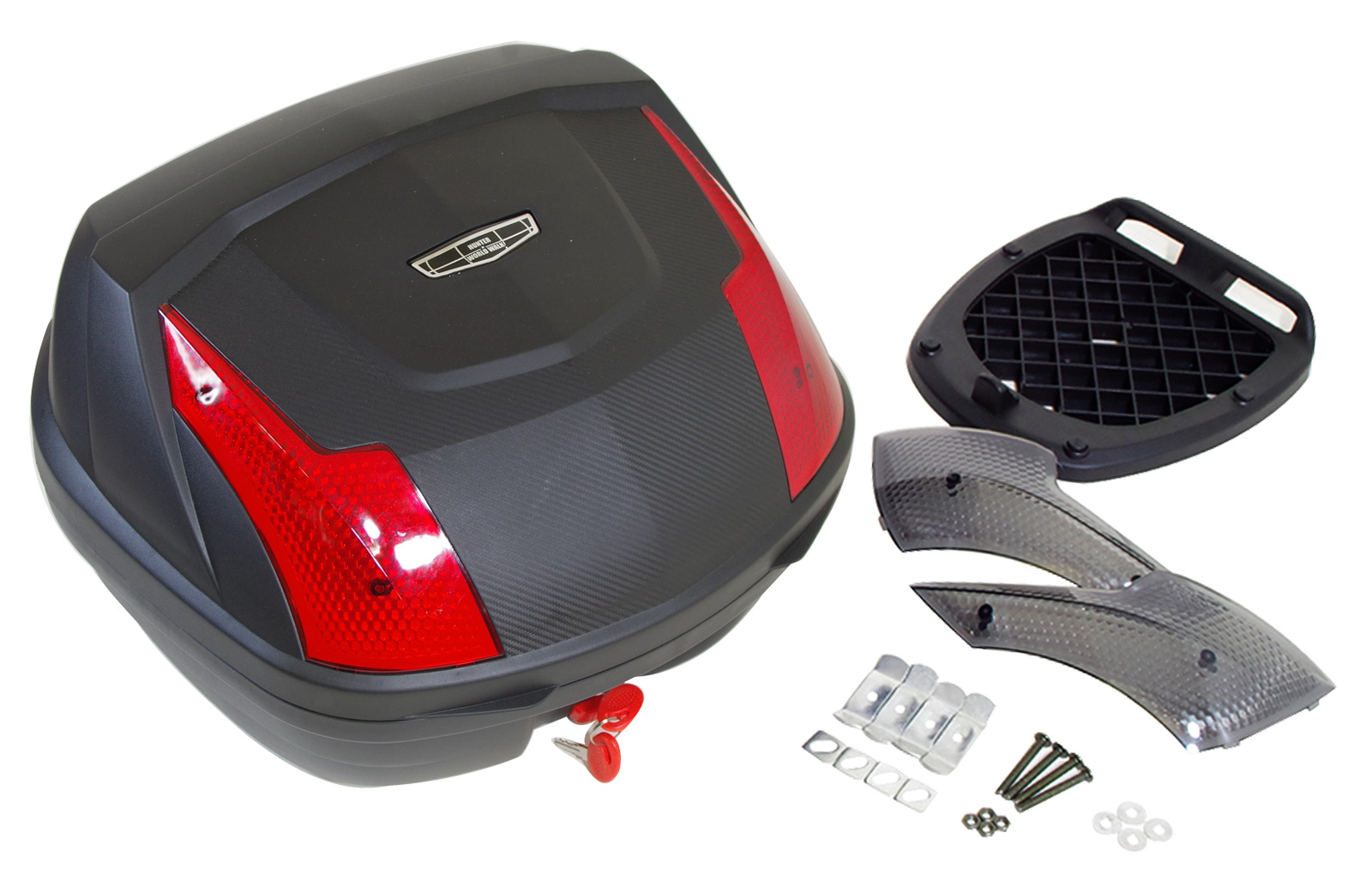 レブル250/500用リアキャリア×1ツーカラーズレンズリアボックス 32リットル×1 取り付けに必要な台座・ネジ類が付いたフルセット。更にセット販売だけの限定特典 リアボックスインナーを付属します。リアキャリア 最大積載量:5キロリアボックス容量|大きさ:32リットル/縦:31センチ 横:47センチ 奥行き:42センチ