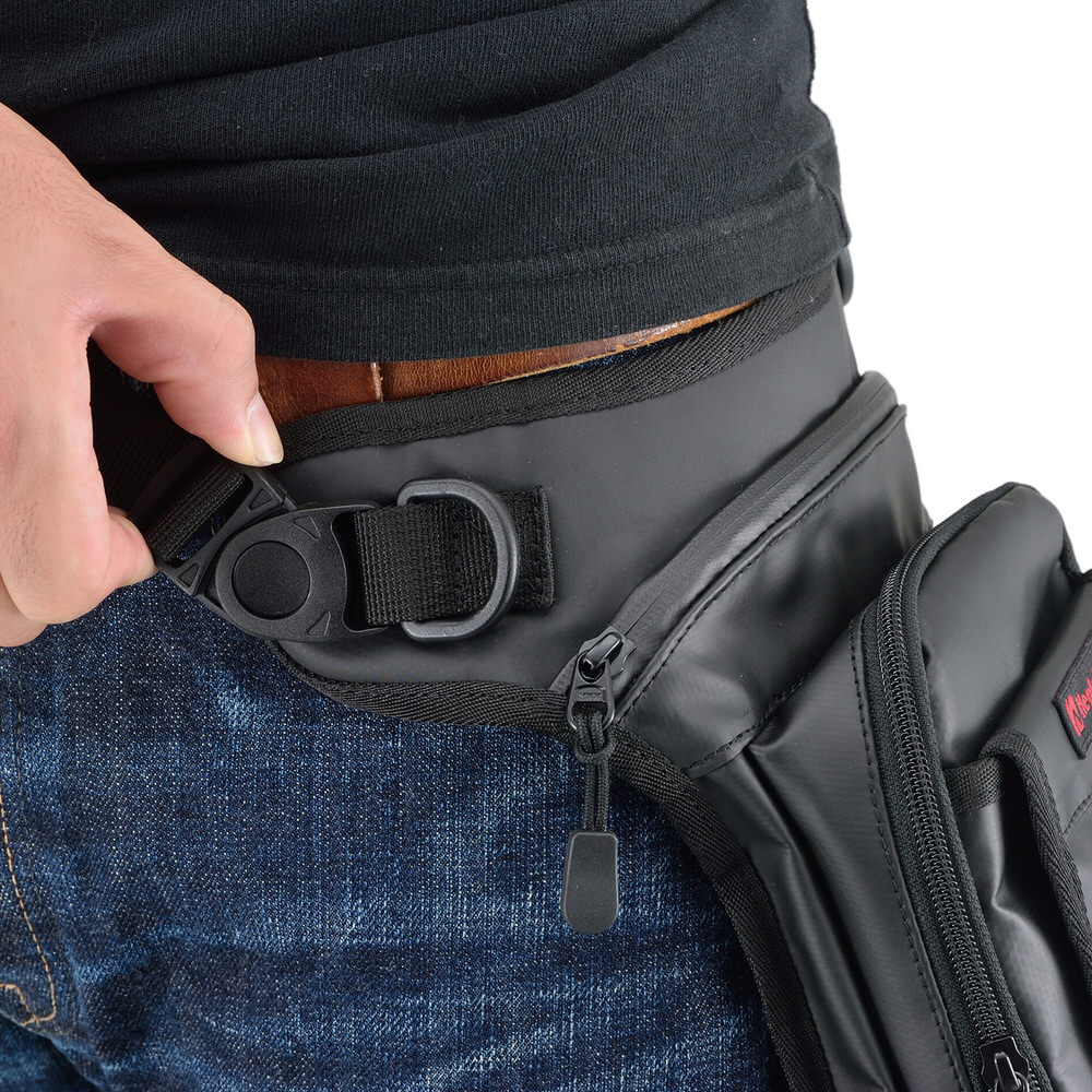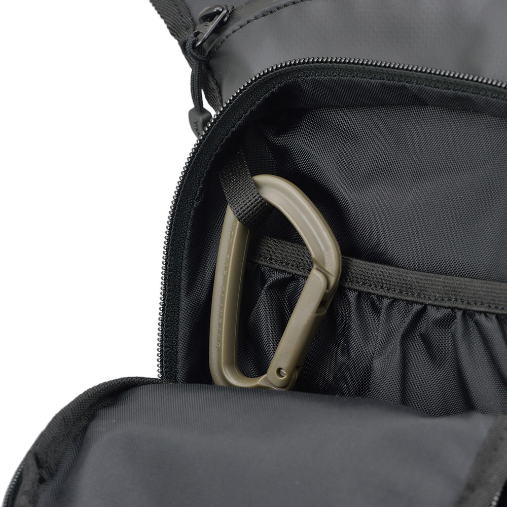 身の回りのものをスッキリ身に付けられるホルスタータイプのバッグ。メイン収納のほか、長財布がすっぽり入る長物収納、4.7インチのスマートフォンが入るフラップ収納の3室構造。素材は水に強いターポリン。メイン小物収納:縦195×横130×厚み30(mm)/長物収納:縦230×横130×厚み35(mm)/フラップ収納:縦160×横100(mm)素材:ターポリン(ブラックファスナー仕様)