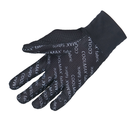 甲側には表面を凸凹にすることで表面積を増やし高い速乾性を誇るディンプルタイプのライクラメッシュ、掌側には操作性を重視した薄手の吸汗速乾クールマックス、そして手首にはストレッチ性のあるライクラ生地と、異なる3素材を適材適所に配したストレッチインナーグローブ。夏のみならず冬でも手をサラリと快適に保ち、グローブの着脱をスムーズにする通年インナーグローブのベストバイ。