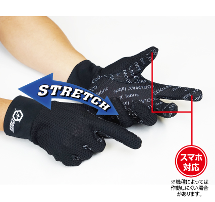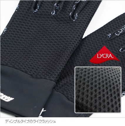 ぴったりフィット・ストレッチタイプの快適インナーグローブ甲側には表面を凸凹にすることで表面積を増やし高い速乾性を誇るディンプルタイプのライクラメッシュ、掌側には操作性を重視した薄手の吸汗速乾クールマックス、そして手首にはストレッチ性のあるライクラ生地と、異なる3素材を適材適所に配したストレッチインナーグローブ。夏のみならず冬でも手をサラリと快適に保ち、グローブの着脱をスムーズにする通年インナーグローブのベストバイ。カラー: ブラックサイズ: XL素材: クールマックス、ライクラメッシュ