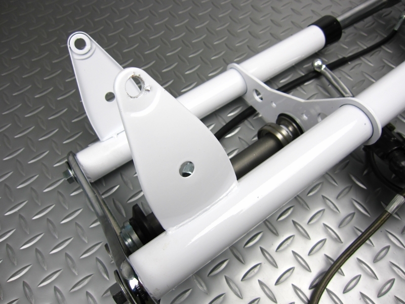 【特長】ダックス用ディスク化フロントサスペンションキットです。フォーク長はローダウン仕様の540mmです。2ポットキャリパーのディスク化パーツがセットです。ベアリング一式がセットです。【仕様】ディスクフォーク有効長: 540mm初期型ダックスフォークピッチ: 167mmφ155ディスクローターDOT4フルード仕様ステンレスメッシュフルードホースアルミ製シルバー塗装ハブハンドルピッチ: 100mm4本スポーク用ハブ【セット内容】ディスク用フォークAssy×1式ディスクハブAssy×1式メーターケーブル×1メーターギア10インチ用×1フルードホースステンレス製×1ブレーキレバー×1キャリパー2ポットAssy×1ディスクローターφ155×1ディスクローターボルトNSR×3ベアリング×1式【取り付け時の注意事項】※取り付け時にスロットルパーツ交換、ミラーアダプターM8逆ネジ変換が必要です。※ヘッドライト幅調整のためスペーサーを別途ご用意ください。※適合ホイール: 10インチは3.50J迄※タイヤサイズによってはフォークと干渉する場合があります。メーカーおよび生産国: 中国製