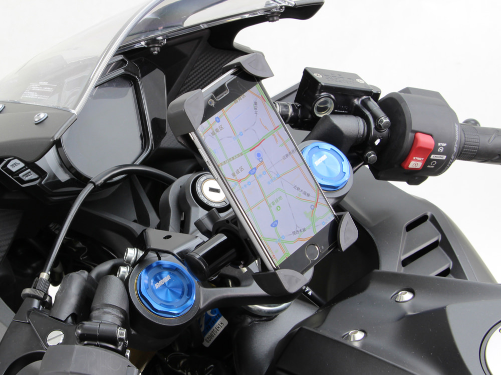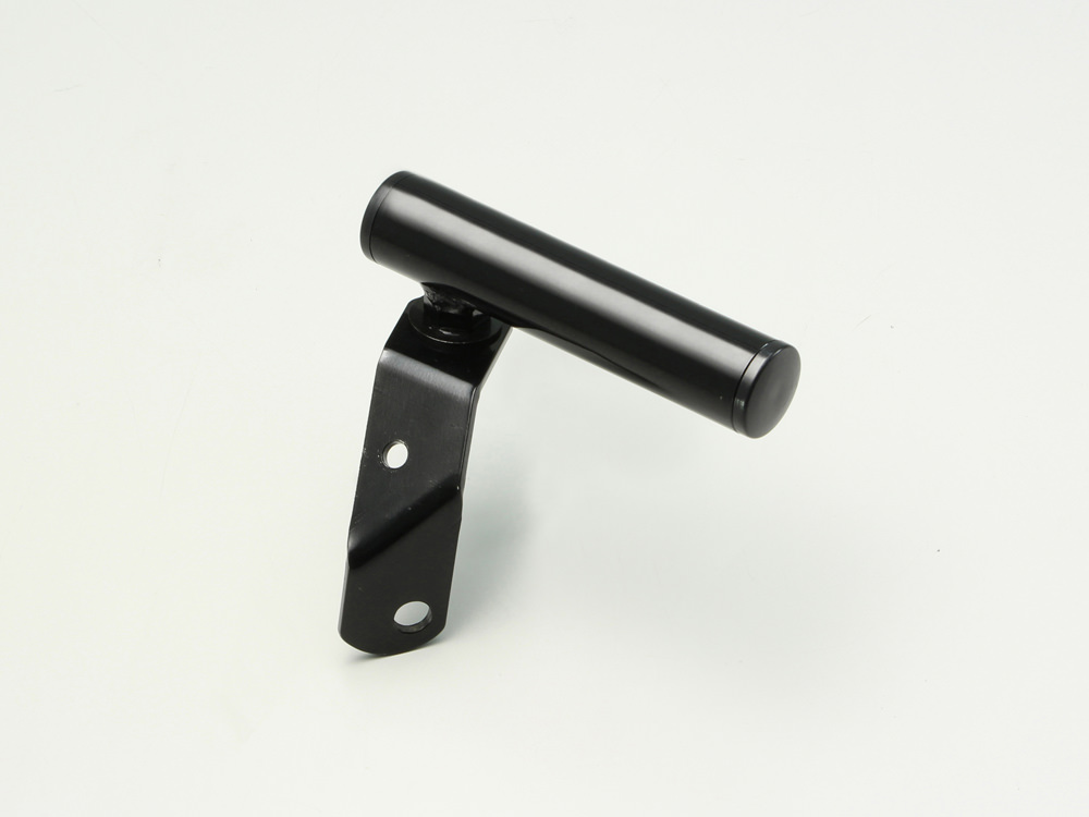 取付側は M 8 用の穴でトップブリッジの左側の割締めボルトに挟み付けて固定します。バー部分は水平方向に回転して調整できます。スマートフォンや E T C 等のホルダーの取付に便利。スチール製バー外径:22.2mm有効長:68(全長 100)mmカラー:ブラックUSB 電源なしは樹脂キャップ付
