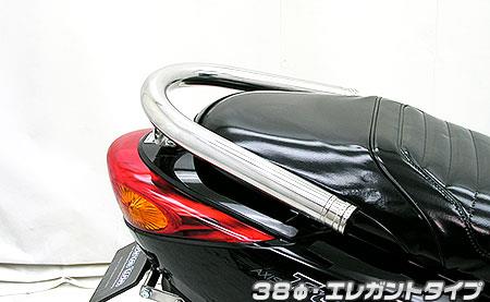 今、ローダウンはスクーターカスタムの定番となっておりますが、そのローフォルムに合わせて出来るだけ車体全体を低く見せるために、車体との一体感を追求したタンデムバーを開発いたしました!車体に沿うように低くデザインされているのでボディラインにフィットし、かつ極太の38mm径のステンレスパイプを採用しましたので、存在感、目立ち度は抜群です!仕上げはバフ掛けを施していますので、高級感タップリでドレスアップには最適の逸品です!バーが極太なので、パッセンジャーが握りやすく力を入れやすいので、安全性も高くなっております。