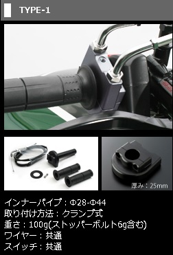アクティブ スロットルキットは、インナーパイプを交換することで、乗りやすさの要となるアクセル操作のセッティングを可能にします。巻取径を大きくして、少ない手首の返しで瞬時にワイドオープンさせる仕様もよし、 逆に小さくして、より繊細なコントロール性能を得るのもよし。あなたのバイクスタイルに合ったスロットルを手に入れてください。【アクティブスロットルキットTYPE-1の仕様】スロットルホルダー: メンテナンス性に優れる分割タイプ ボルト二本で簡単にホルダーを外せる為、ワイヤーへの注油やレースでのアクシデント時に取り外しを容易にできるメリットがあります。海外のレースでも使用されています。インナーパイプ: φ28〜φ44取り付け方法: クランプ式重さ: 100g(ストッパーボルト6g含む)ワイヤー: 共通スイッチ: 共通【アクティブスロットルキットTYPE-1の特徴】スロットルのコントロール性能向上フリクションを低減し、軽やかな操作を実現ハンドル周りを一新するスタイリッシュな外観スイッチボックスからの独立でメンテナンス性アップアクティブエラストマーグリップ付き【本製品仕様】ワイヤー金具: ステンレス巻取径: φ44ホルダーカラー: ブラック