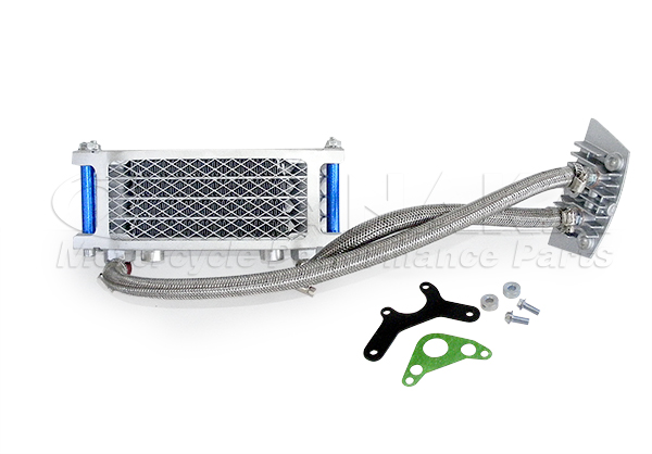 大容量4段アルミオイルクーラー ボアアップ等で油温上昇による熱ダレ対策に最適の商品です。【付属品】メッシュホース、オイル取り出しユニット、取付ステー【材質】アルミ【注意事項】※付属のインマニ取り付けボルトと共締めステーで装着の場合は装着部にオイルクーラーがフレーム等に干渉せずに取り付け可能な充分なクリアランスがあるかご確認ください。※オイル取り出し口は12V純正ヘッド等のベアリング付カム用