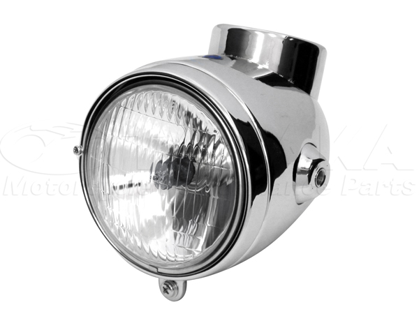 モンキー用 4Lモンキータイプヘッドライト メッキ5Lモンキーのスピードメーターが装着可能です。※台湾製【適合】 4Lモンキーインジケーター付(ブルー)※12V30/30Wバルブ付【材質】 ケース/スチール レンズ/ガラス【サイズ】 レンズ径:φ95 取り付け幅:130mm【注意事項】※スピードメーターは付属しません