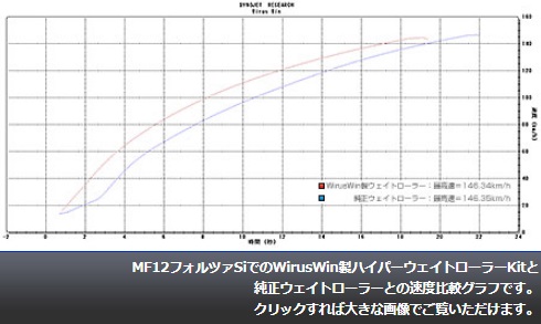 車体型式:JBH-CA4BA/O2センサー装着モデル・SEPエンジンモデルに適合します。社外品マフラーを装着した際に発生するトルク不足を解消し、さらにパワーアップさせる駆動系Kitをご用意しました。ノーマルのウエイトローラーと交換するだけでゼロ発進から最高速までズムーズに加速します。絶妙な設定で高速性能ダウンする事無く低速を強化します。回転の落ち込みムラが無く、細かいアクセル操作で前に出たい時にすっと車体が反応してくれますので町中のすり抜けには抜群の効果を発揮します。WirusWin製ハイパーウェイトローラーKitと純正ウェイトローラーとの速度比較グラフでは、WirusWin製ハイパーウェイトローラーKitの方がゼロ発進時の速度の立ち上がりが抜群に良く、その差が最高速到達まで続き、結果、最高速到達時間が大幅に短縮されている事が分かります。ハイパーウエイトローラーKitは社外品マフラーに合う基本的なキットです。社外品マフラーを取り付け、基本セッティングが出ていない状態から駆動系をベストに合わすのはかなりの労力を費やしてしまいます。まずはハイパーウエイトローラーKitを取り付け、良い状態からベストセッティングに合わせる事をオススメします。また、ノーマル純正マフラーでも同様の効果を見込めます。※ハイパーウェイトローラーKitの取り付けには専用工具や専門知識等が必要になりますので、ウイルズウィン社商品取扱いショップ等、整備に精通している方に取り付けを依頼下さい。