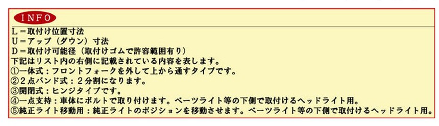 備考:取付けクランプ径:39/41 長さ:110 ダイキャスト アルミバフフロントフォークを外して上から通すタイプクラシックの定番中の定番。風合いの有るアルミ鋳造バフ仕上げ。汎用品につき取付け時に車体との干渉を確認しヘッドライト等を選択して下さい。Lは取付け面からの前方距離を、Dは取付けクランプ径を、Uはアップ寸法を表しています。商品により付属のスペーサーゴムは異ります。サイズにより組み合わせて対応して下さい。