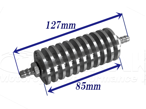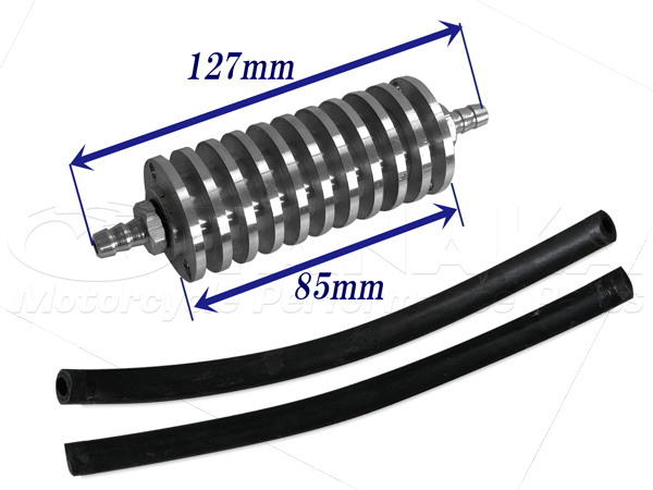 アルミ削り出しコンパクトオイルクーラー【長さ】 85mm【付属品】 ゴムホース(20cm×2)【材質】 アルミ削り出し【注意事項】※オイル取出しユニットは付属しておりません、別途ご用意ください。