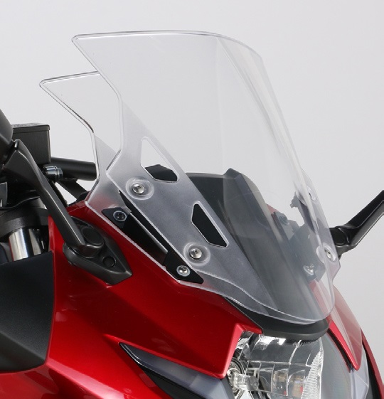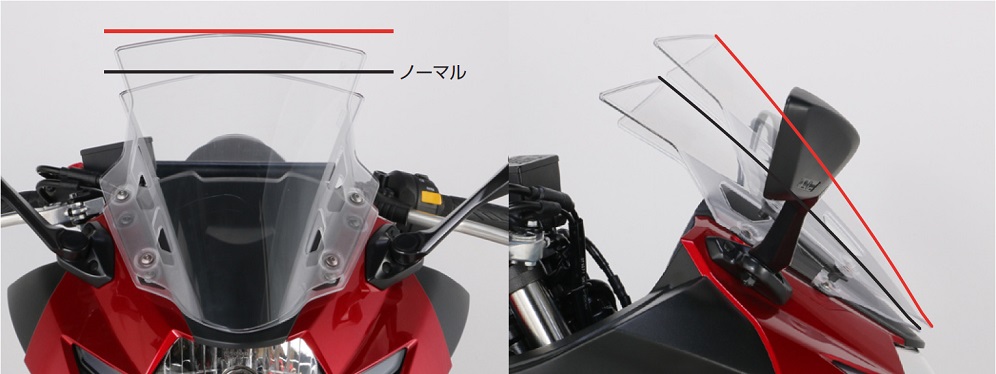 スクリーンアップスペーサーはノーマルスクリーンを約10°起こし、伏せた際に防風効果が発揮されライダーへの負担を軽減します。スクリーン取付角度: +10°ノーマルスクリーン使用ステー: スチール製ブラックボルト/ウェルナット付属