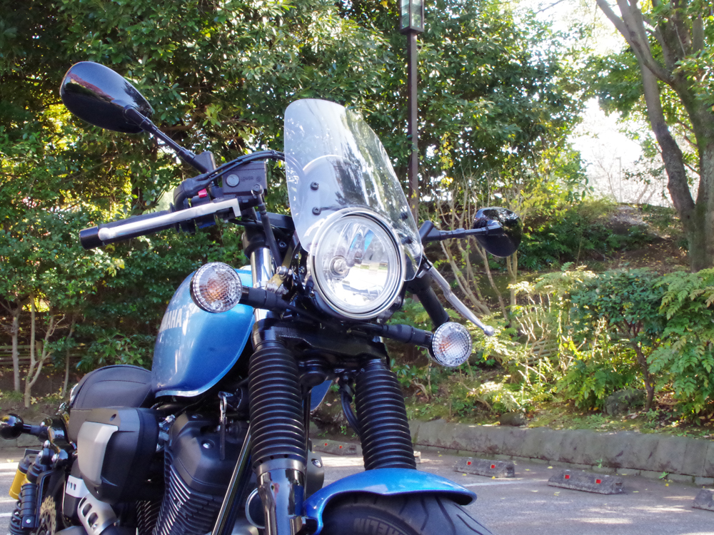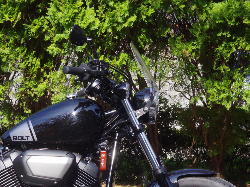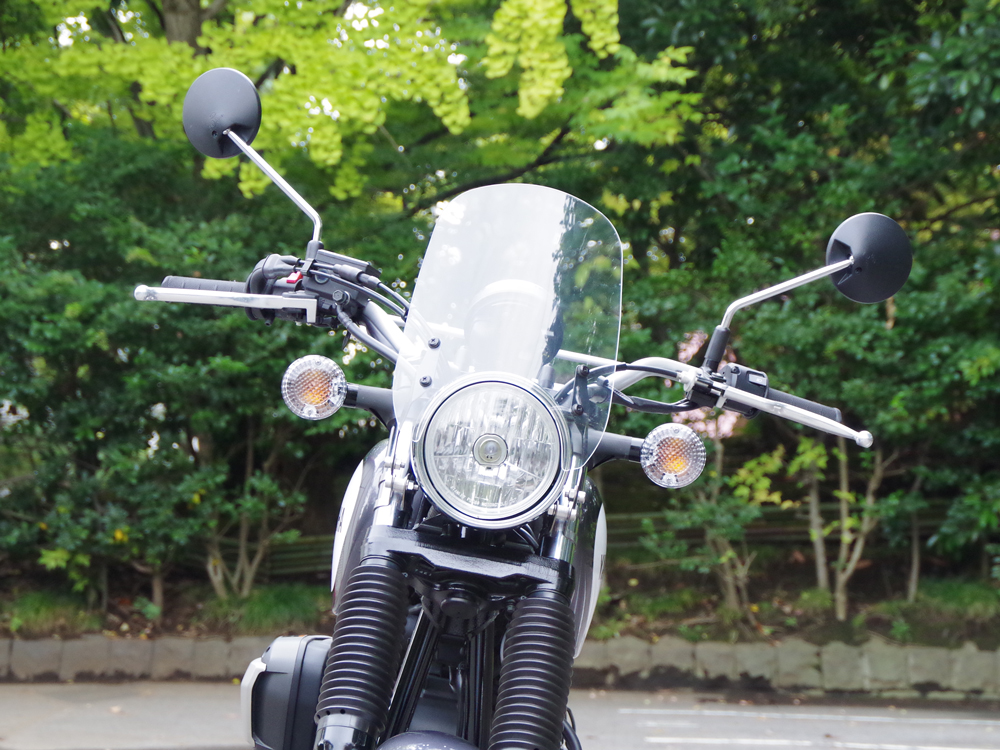 スクリーン:クリア、アクリル スクリーン取り付けステー:スチール フロントフォーク取り付けステー:ステンレスロングタイプスクリーンサイズ:縦340mm×横240mm快適性や疲労の軽減に使えるウインドスクリーンはワールドウォークの看板製品です。冬だけつけて、夏ははずしたい。ツーリングの時だけつけて、普段ははずしたい。ハーレーのオプション品のようなワンタッチで脱着するデタッチャブル機構は素晴らしいですが、複雑なので生産に手間がかかり価格が高くなってしまいます。そこでワールドウォークが新たに脱着が簡単なウインドスクリーンを開発致しました。取り付けはフロントフォークインナーチューブ部分にステーを追加して行います。各車種のインナーチューブの太さに合わせてステンレスをレーザーカットして製作。フロントフォークのφ数にあわせて1mm単位で正確に作るのは難しい作業ですが下町の工場の技術力で実現しています。ステー、取り付けボルトは全てステンレス、更にアルミ製のカラーを付属しています。どちらも錆や腐食に強く劣化しにくい特徴があります。※スクリーン取り付けステーはスチールを採用しています。ステーの設置、スクリーンの設置それぞれ2本のボルトを使っています。外したい時にはボルトを2本外すだけなので脱着は非常に簡単。気分や用途、季節にあわせて脱着が可能です車種によってフロントフォークのφ数やヘッドライトとの位置関係が異なるのでステーは専用設計で製作し、スクリーンも車種によって取り付け可能なものを選択しています。