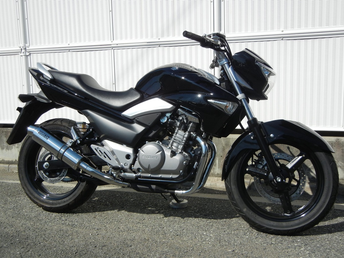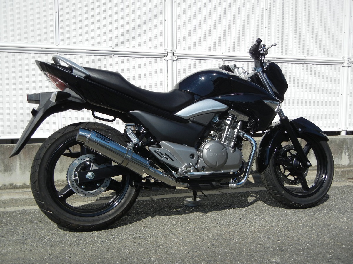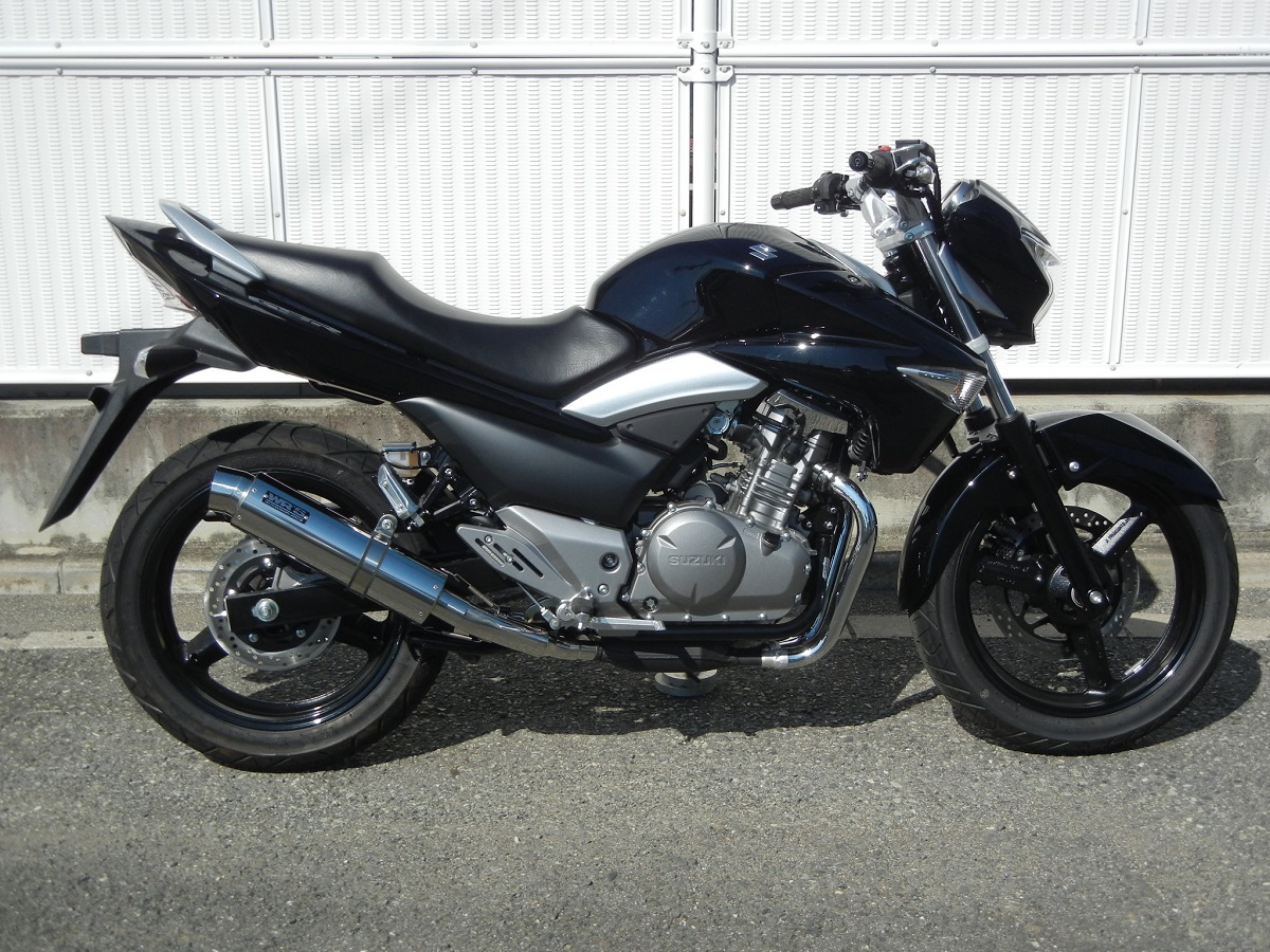 ベンチテストにより徹底的に性能をチェック、GSR250 の特性をより活かすべく開発しました。 ・センターパイプにはテーパー(φ38→φ50)を採用する事により理想的な寸法を確保。低中速域〜高速域に至るまで伸びのある加速感を実現、GSR250 の特性をアップデートしています。 ノーマルの性能曲線を下回る事無くパワーUP を実現、右側 1本出しを採用する事で大幅な軽量化も実現しています。 (ノーマル重量 9.4kg に対して 7.2kg〜7.5kg の軽量化に成功!) サイレンサーから奏でる音質は、並列 2 気筒の持つ連続音を低音の効いた心地よいサウンドに変貌させてくれます。近接/加速騒音値:91/79dbOF/Dボルト:OK政府認証コード:JMCA認証