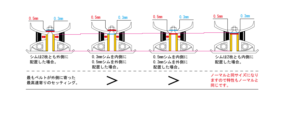 シムとボスの組み合わせにより細かな変速域のセッティングが可能!プーリーのセンターに位置するプーリーボスの長さを変える事によって、ドライブベルトをよりプーリーの外側に移動させる事が可能になり、最高速アップが望めます。また、2枚付属しているシムの取付位置により、細かな特性のセッティングが可能です。ボスサイズ: 内径×外径×全長(ボス本体): φ15/φ24/46.7mmシムサイズ: 外径24mm 内径15mm 厚み0.3&0.5mm【備考】補修用スペーサーシム ※別売: (0.3mm)0900-463-90013/(0.5mm)0900-463-90014