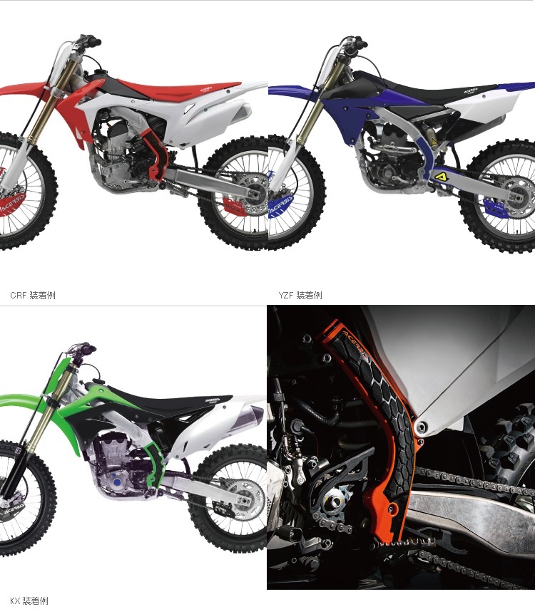 「守る」から「操る」へ進化したフレームガード 斬新な2ピース構造でフレームを守りつつグリップ力を付加したニュースタンダードガードacerbisが打ち出した新機軸の斬新な2ピース構造フレームガード。従来のプラスチックフレームガードにウロコ加工を施した硬質ゴムを一体化。守ると同時にグリップ力の向上が付加されマシーンコントロールが一層容易になりました。見た目に違わぬスパルタンな優れた機能はこれからのニュースタンダードです。カラー: ブルー×ブラック