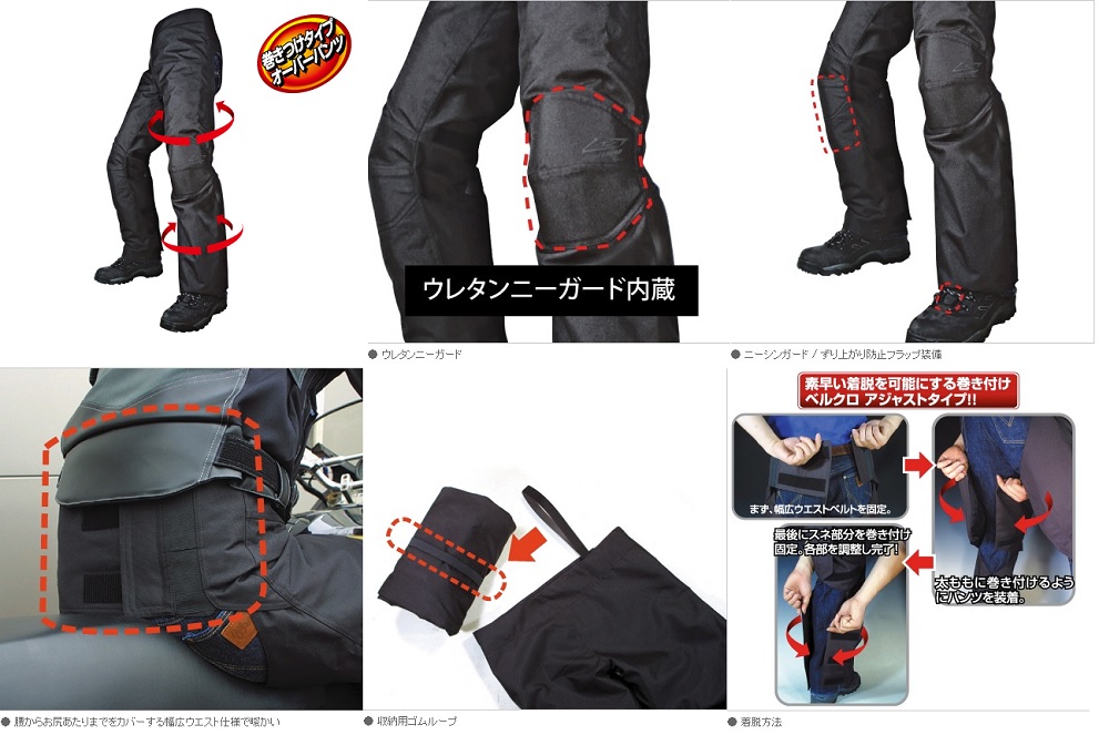 ラッピング式の防風防寒の簡易パンツ 靴を脱がずに装着脱着が可能身体に巻き付けてベルクロアジャストしながら装着する、防風・防寒のラッピングタイプのパンツです。駅、会社、あるいは学校に着いてから、靴を脱がずにあっという間に脱げる簡便さは朝の忙しい時間に大変便利。脱いだあとも丸めて付属ループでくくればコンパクトにまとめられる収納上手。カラー: ブラックサイズ(inch): BM(38-44/身長165-175cm)素材: 表地/バリアクロス600D PU加工