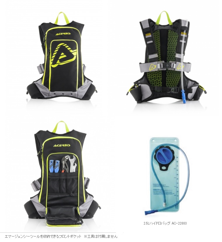 クロスショルダーベルトでしっかりホールド エキスパート仕様ハイドロバッグバックパックは14.5Lの大容量、ハイドロバッグは給水がしやすいメモリ付きの2.5Lとレースシーンから ツーリングまで様々なシーンで活躍。大開口キャップの採用で給水しやすく洗浄もしやすくなっています。水量調節ができるバイトバルブ(吸い口)によりヘルメットを被ったままでも必要な量の水分補給が手軽にできます。 左右連結できる特徴的なクロスショルダーベルトで快適かつずれの少ないフィッティング、さらにウエストベルトでホールドすることで重さを感じさせません。背面は通気性に優れたエアスルーパッドを採用。 更に進化したエキスパート仕様のドリンクバッグです。カラー: BLACK×YELLOW材質: ポリエステル容量: 荷室14.5L 2.5Lのハイドロバッグ付属