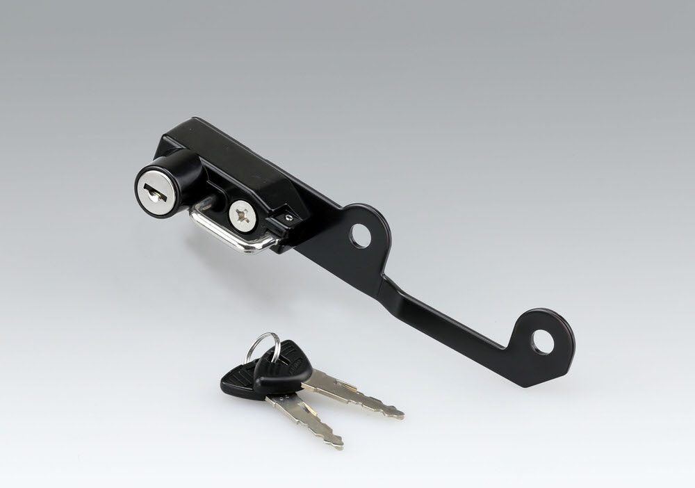 2017年モデルに対応したタンデム時に便利なヘルメットロックが登場。スチール製 ブラック仕上げタンデムステップ右側に共締め。