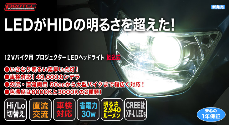 ノーマルのLEDヘッドライト、暗く感じませんか?PCXやNMAXなど125cc以下のスクーターのLEDヘッドライトをはじめ、中型〜大型バイクのノーマルLEDヘッドライトはハロゲン球式ヘッドライトと違いアフターパーツのHIDやLEDに交換して明るくする事が出来ません。明るくするには増設ライトを装着する事が最適な手段です。が、市販されている大多数のスポットフォグ等では光量不足。しかもHiビームへの切替えがで出来ないので暗闇の峠道では視認性が悪く、精神的にも疲労の原因になります。プロテックのHi/Lo切替え式LEDプロジェクターヘッドライトはそんな不満を改善した【Night RUN】の心強い味方です。カスタムの可能性、無限大!ノーマルヘッドライトの形、大きさ、明るさなどご不満のライダーに新たな提案!スーパーモタード、ストリートファイター、アドベンチャー、ストリートドラッグ、アメリカンなど個性豊かなカスタム車のヘッドライトに!他にFRPレーシングカウルのヘッドライトにも使用可能。バイクのカスタムの方向性を無限に広げるヘッドライトです。業界初!Hi/Lo完全切替え機能搭載!プロジェクターヘッドライトのHi/Lo切替えはYZF-R1(09〜14年)が採用していますが、ZZR1400やYZF-6Rなどの多くの車種はHI側Lo側それぞれ独立したプロジェクターライトが装備されています。本製品は1個のプロジェクターでHi/Loの切替えを完全に行います。車検対応!本製品は車検対応品です。車検適合基準の光度15,000cdに対して40,000cdを有しております。2種類の発光色!クールな青白い6000K(画像: 左)と視認性の高いハロゲン電球色の3000K(画像: 右)からお好みの色温度をお選びください。どちらも車検基準に適合いたします。Loビーム照射が標準と近接の2タイプHiビームに対してLoビーム照射位置が【標準タイプ】と【近接タイプ】の2種類からお選びください。近接タイプは標準タイプよりも照射位置が手前になります。Loビーム照射位置イメージ【標準タイプ】と【近接タイプ】HIDを超えた明るさと省電力入力電力は30Wと省電力。明るさの目安としては、55Wハロゲン球の約3倍、35W 6000KのHIDと比較して同等以上の明るさがあります。いきなり明るい素早い点灯!HIDと違い電源投入直後からフルパワー点灯します。またHIDのように徐々に発光色が変化する事がありません。防水電動ファンによる強制冷却本当に明るいLEDは入力電流が大きいため発熱し高温になります。その熱を冷却するために、本製品では内蔵された電動ファンによる強制空冷を採用しました。ファンは防水、耐震に優れたラジエーターに採用される規格の物と同設計で安心です。ファンによる強制冷却はヒートシンクによる大気開放に比べて安定した明るさを保つ最適な方法です。信頼のCREE社製LED採用!発光体にはCREE社製XLamp XP-L LEDsを6個使用しています。【発光部の形式: FLH-880】車検対応DC/AC12V共用 30W/30W 6000KHONDA FI交流点灯車(スーパーカブ110[JA07/JA10]、グロム、ズーマーXなど)別売りのPROTECH品番: 15203を必ずご使用ください。バッテリーを取外した車両に使用する場合は別売りのPROTECH品番: 65016を必ず装着してください