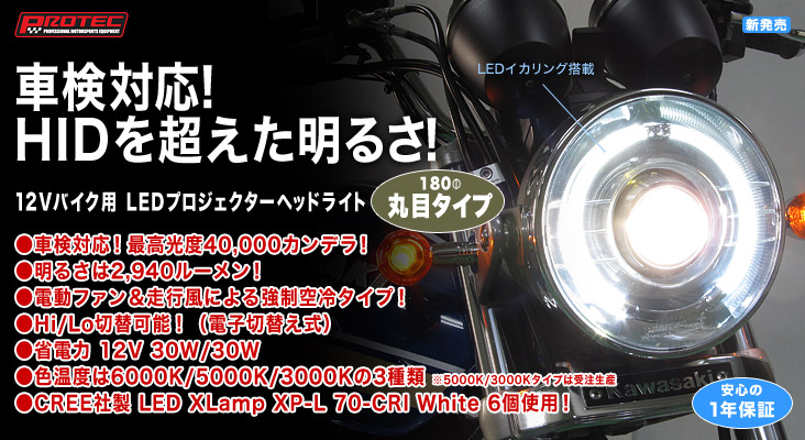 車検対応! 本製品は車検対応品です。車検適合基準の光度15,000cdに対して40,000cdを有しております。(※PROTECH社測定結果)最高光度は約400hcd(40,000cd)で、車検適合基準値である15,000cdを楽々クリアしています。BANZAI製 HT-322型ヘッドライトテスターを導入して車種ごとに光軸測定を行っております。HIDを超えた明るさと省電力!本製品の明るさは2,940lmです。一般的な35W H.I.D.の2,700lmと比較しても明るさは上回っております。長寿命! 一般的なハロゲンバルブの寿命(約400時間)よりも、H.I.D.の寿命(約2,000時間)よりも更に長寿命です。※PROTECH社測定結果省電力設計! 消費電力はHi/Loそれぞれ30wですので、一般的なH4ハロゲンバルブ(60/55W)よりも省電力です。信頼のCREE社製LED採用! 発光体にはCREE社製XLamp XP-L LEDs 70-CRI WhiteをHi側、Lo側にそれぞれ3個づつ使用しています。電子式Hi/Lo切替え! 従来品ではHi/Lo切替えをモーター駆動にてプロジェクター本体を上下に可動させて行っておりましたが、本製品ではプロジェクター内部にHiビームとLoビームそれぞれのLEDを配置し、発光点を変化させる事でHi/Loを切り替えます。取り付け簡単! H4バルブカプラー差替えで配線が簡単です。いきなり明るい素早い点灯! HIDと違い電源投入直後からフルパワー点灯します。またHIDのように徐々に発光色が変化する事がありません。入力電圧変化による光量変化がほとんどない! 本製品は、入力電圧が1V下がっても光度がほとんど落ちない設計となっております。PROTECH社測定において入力電圧10V時の高度は12V入力時と比べて2.5%ダウンとなります。電圧が低くなった旧車でも車検に合格する事が可能です。電動ファン&走行風による強制空冷タイプ 本製品は、内蔵されたファンと走行風を本体ユニット全体に当てる事でLEDの発熱を強制的に冷やす設計となっております。停車中もファンによる強制空冷の為、従来品の様な減光機能が不要となりエンジン回転信号を入力する必要がありません。LEDイカリング搭載! ヘッドライトの点灯に連動してLEDイカリングが点灯します。【取付け時の注意事項】※取付けについては熟練したメカニックのいる指定整備工場などで行ってください。※取り付け後は必ず光軸調整を行ってください。※詳しくは道路運送車両の保安基準を参照ください。色温度: 6000K適合車種: φ180ネイキッド汎用