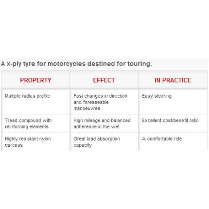 アグレッシブ・バイアス!最新のバイアステクノロジーにアグレッシブなパターンを融合、スポーティバイアスタイヤの新基準。スポーティな断面形状により、軽快なハンドリング、あらゆる速度域でのファンライディングを実現。アグレッシブなトレッドパターンがウェット性能を向上させるとともに、偏摩耗を抑制しランニングコストを低減。ニューシリカコンパウンドが低温時やウェット路面においてもすばやいウォームアップと優れたグリップを実現。軽量バイアス構造があらゆる走行条件での安定した操縦性を発揮。