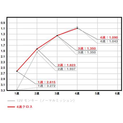 ノーマルミッションは各ギア比が非常に離れている設定になっている為、カスタムエンジンでのストリート走行では扱いにくいことがあります。●SP武川では多くの人にクロスミッションの良さと扱い易さを実感していただく為、ノーマル部品を利用出来る様に設計し、リーズナブルな価格設定を実現しました。●このキットは1・2・4速のギア比を3速に近づけたギアを製作し、クロスミッション化したキットで3速ギア及びカウンターシャフトはノーマル部品を使用。●スペシャルクラッチキット(4/5/6速ミッション用)・マニュアル強化クラッチキットとの同時使用も可能です。●※モンキーAB27系の車両の一部では、Lクランクケースのキックスターターギア近辺のケース肉厚が厚く変更されている為、ギアと干渉する場合があります。干渉する場合は干渉部分を削る等のケース加工作業を行う必要があります。※モンキーR(AB22-1000174~1011925)はBタイプスターター(02-04-0011)に変更して下さい。●※ガスケット類は別売になります。※SP武川製5速・6速ミッションに採用されているドッグ部分のテーパー加工はありません。●12Vモンキー・ゴリラ・モンキーBAJA(ノーマルミッション) 1速:3.272 2速:1.937 3速:1.350 4速:1.043●モンキーR/RT(ノーマルミッション) 1速:3.272 2速:1.937 3速:1.350 4速:1.090。●4速クロスミッション 1速:2.615 2速:1.823 3速:1.350 4速:1.090。●※12Vモンキー(FI)には取付け出来ません。FI専用ミッションがあります。●4速クロス。●現マニュアルクラッチ車用。