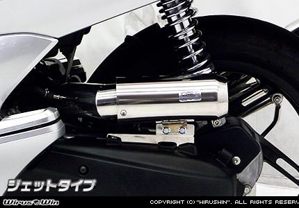 PCX用サイレンサー型エアクリーナーKit ジェットタイプです。●お好みに合わせて吸入口の形状を、バズーカータイプ、ポッパータイプ、ジェットタイプ、スポーツタイプの4種類から選択していただけます。吸入口の形状が違うだけで4種共基本性能は同じです。●ボディはステンレス製で、還元パイプ対応です。ノーマルエアークリーナーから、簡単にボルトオンで付け替えできます。ローダウン車両にも対応いたします。●クリーナーにはパワーフィルターが装備されています。従来はパワーフィルターにあわせて、キャブレターのセッティングを行わなくてはいけませんでしたが、この商品は必要吸気量にあわせて無段階に調整できますので、キャブレターを取り外したりする作業が必要ありません。還元パイプ対応ということもあり、簡単にセッティング出しやすく、パワーアップが計れます。●ノーマルマフラー、ウイルズウィン製マフラーを付けた場合のエアーの量は、最小限から、15ミリ〜25ミリのばした範囲で、ベストセッティングが捜せ出せます。●※ボアアップ、駆動系、抜けの良いマフラーに変更などの改造をされている場合は、インジェクションコントローラーなどでのセッティングが必要となることがあります。また、さらなるパワーアップを望む方にもインジェクションコントローラーなどでのセッティングは必要です。ノーマルマフラー、ウイルズウィン製マフラーでの組み合わせでは問題はありません。●デザインカスタム重視の方、手軽にパワーフィルター化したい方などに特にお勧めです。WirusWinステッカー、WirusWinプレート付属。