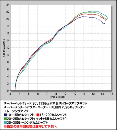 カムシャフトは10・15D・15・20D・20・25D・25・30Dの4種類があり、使用用途に合わせて交換し、走行性能を楽しむことが出来ます。又、スーパーヘッド 4V+Rシリンダーヘッドはロッカーアームを取外さなくてもカムシャフトの脱着が可能な為、車両に搭載している状態でもカムシャフトの交換が容易に行うことが出来ます。