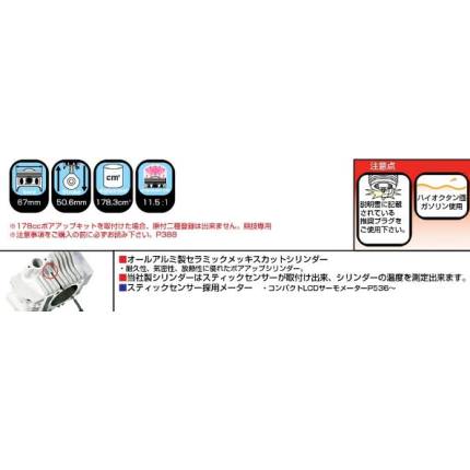 ノーマルヘッド用のスカットピストン、オールアルミ製セラミックメッキスカットシリンダー、カムシャフト、ガスケット類がセットになっております。■オールアルミ製セラミックメッキスカットシリンダー・耐久性、気密性、放熱性に優れたボアアップシリンダー。■SP武川製シリンダーはスティックセンサーが取付け出来、シリンダーの温度を測定出来ます。※178ccボアアップキットを取付けた場合、原付二種登録は出来ません。競技専用※注意事項をご購入の前に必ずお読み下さい。
