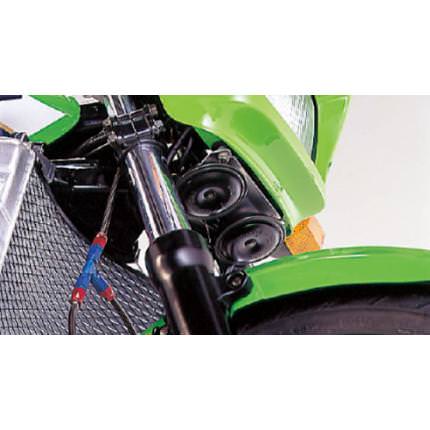 正面から泥や雨を受けやすい場所にあるノーマルホーンを、カウル近くに移動させるためのステーです。ビッグラジエーターに交換した場合にも便利でスタイリッシュに収めることが可能です。
