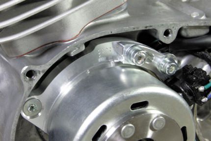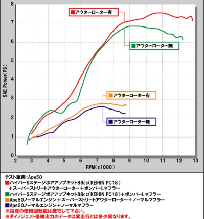 乗り易さと性能アップの両立:一般的に市販されている高出力だけを追求した軽量アウターローターやストリートでは扱い難いインナーローターとは異なり、乗り易さと性能アップの両立を考えて開発され、走行スタイルやチューニングの異なる全てのユーザーに幅広く使用して頂けるアウターローターキットです。ローター本体は慣性力を残す為にノーマル比約80%(約φ110mm→約φ88mm)の小径化と約50%(約1065g→約536g)の軽量化を採用しました。これにより、扱い易く、クランクシャフトヘの負担を大幅に低減することが出来ます。●ノーマルアウターローターと武川製アウターローターの比較:武川製ローター:外径Φ88mm / 内径Φ77mm / 重量約536g ノーマルローター:外径110mm / 内径84mm / 重量1065g●点火エネルギーの強化:点火用コイルをノーマル1基に対し、2基装備することで一次側電圧を強化。高回転域でも高い点火エネルギーを維持します。内部部品がシンプルで、トラブルの少ないアナログC.D.I.を採用。武川製ハイパーC.D.I.の同時装着をお薦めします。07-02-19。他メーカーのC.D.I.などを使用するとエンジンの故障の原因になる場合があります。●ステーターベースの移動により点火時期の調整が可能:ステーターベースの固定位置を移動させ、点火時期を無段階調整で変更する事が出来ます。これにより、ノーマルエンジンからカスタムエンジン、又、使用回転数に合わせた点火時期を調整出来、車両の走行性能をお楽しみ頂けます。調整範囲:上死点前27°~43° 50ccノーマルエンジン標準値:27°100ccノーマルエンジン標準値:30°●必要な灯火出力の維持:灯火用コイルはノーマル6基に対し4基になりますが、指定条件下において低回転からストリート走行可能なヘッドライトの明るさを維持します。●指定条件:ヘッドライトバルブを30/30W、又は25/25W、テールランプを付属のLEDテールバルブ、又はLEDテールランプにすることで、ノーマル同様の明るさに維持することが出来ます。初回ロット限定キットにはノーマルテールランプに使用出来る“LEDテールバルブ”が付属しています。●組付けには特殊工具が必要になります。:フライホイールを固定するローターホルダー:00-01-1001 、フライホイールの脱着時に必要となるフライホイールプ-ラ-00-01-1003 。スーパーストリートアウターローターを装着する場合、車両により簡単な配線の組み換え作業やギボシ加工が必要です。説明書をご覧下さい。