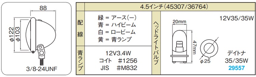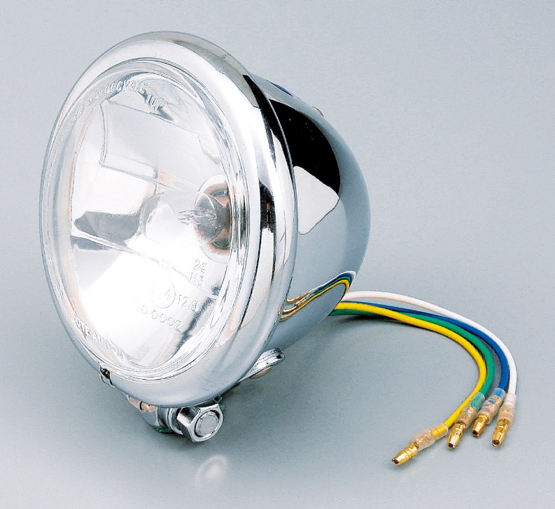 ●60年代ベーツ社デザインのレプリカ。●スチール製クロームメッキ仕上げ。●マルチリフレクタータイプは(36764)と同様のスペックながら配光が良く明るい。●ハウジング上部にハイビームインジケーターランプ(青色)を内蔵。●取付ステーは付属していません。汎用ボトムマウントヘッドライトステー(27550)などを別途ご用意ください。●当社補修バルブ以外ではハイ/ローの極性が異なる場合があります。●汎用品のため、車体側取り付け加工が必要となる場合があります。●ベーシックタイプ(36764)のレンズを別売りのマルチリフレクター付レンズASSY(46190)に交換すれば、配光が良く明るいマルチタイプ同等にバージョンアップできます。