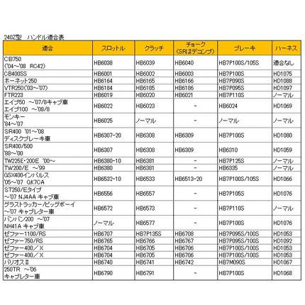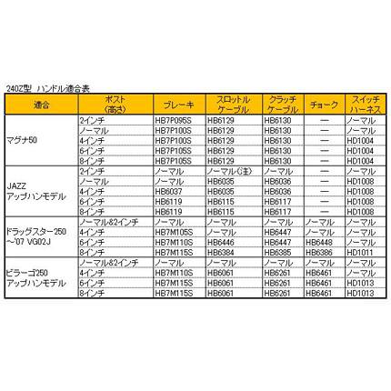 ●φ7/8インチ(22.2mm) ●スチール製、引張強さに優れたSTKM13Aスチール材を使用。 ●JMCA安全基準値クリア ●ドラッグポストには取付不可。ライザーポストを使用してください。(ノーマルポストも使用可) ※(注)スロットルケーブルの取廻し変更が必要。 ●適合については画像の適合表をご確認ください。