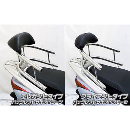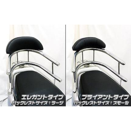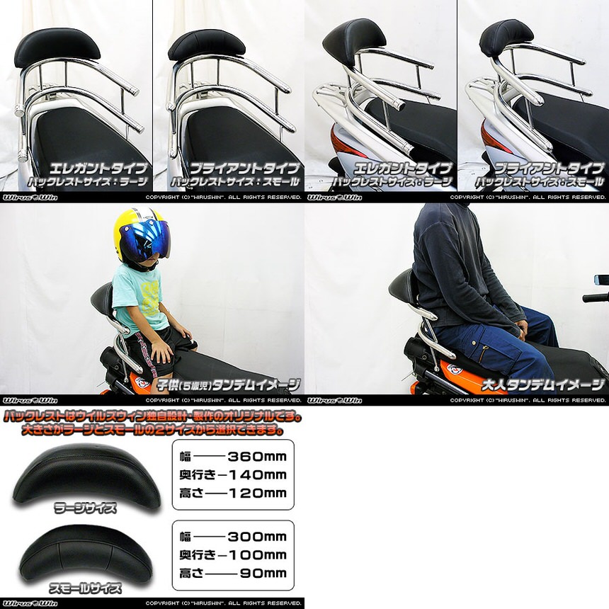 ■受注生産商品となっており、商品手配後 2週間程度入荷にお時間を頂きます。■LEAD-EXには適合未確認。安心して安全にタンデム走行をしていただけるよう、機能面を重視した商品です。子供から大人までしっかりとタンデムを快適にサポートします。●急発進時、横揺れ時、ブレーキング時の転落を防止します。子供、大人をタンデムしてのテスト走行を繰り返し開発した専用特別設計で、パッセンジャーをしっかりサポートしてくれるパーツです。●画像は5歳の子供を乗せた例です。子供も安心してタンデムできます。もちろん大人も安心してタンデムできます。●パッセンジャーの快適性向上のため、大型バックレストを標準装備しております。●表面素材にはノーマルシートと似たシート生地を使用していますので、取って付けた感じは無くとてもマッチします。●オリジナルバックレストは型から興して製作していますので、見た目も良く耐久性に優れるしっかりとした作りになっています。●ラージサイズとスモールサイズの2サイズをご用意しておりますので、お好みに応じて選択して頂けます。(装着画像のバックレストはスモールサイズです。)●材質は、耐久性、耐食性の高いステンレスを使用しています。オールステンレス製です。●仕上げはバフ掛けを施していますので、高級感タップリでドレスアップにも最適の逸品です!●バーが極太なので、パッセンジャーが握りやすく力を入れやすいので、安全性も高くなっております。●お好みに応じてバーエンドの形状を、エレガントタイプとブライアントタイプの2種類から選択して頂けます。