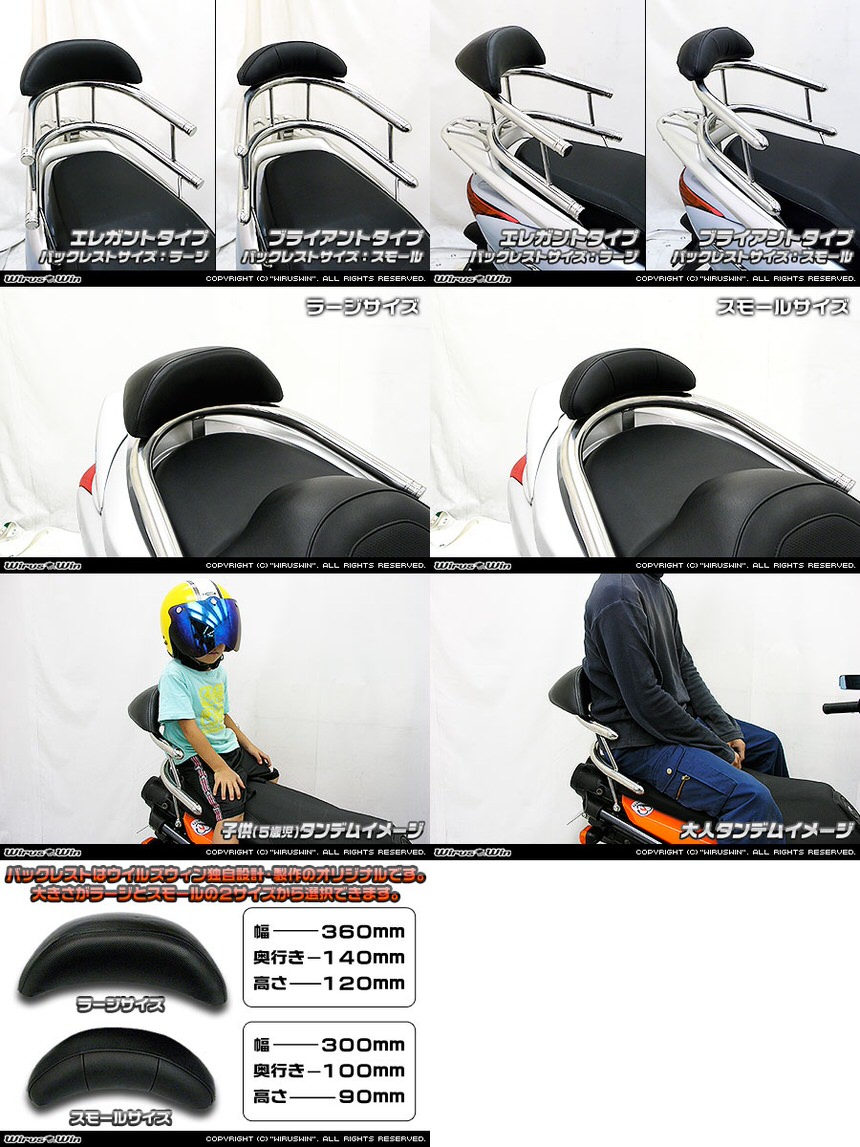 リード110用 バックホールドタンデムバー エレガントタイプです。安心して安全にタンデム走行をしていただけるよう、機能面を重視した商品です。子供から大人までしっかりとタンデムを快適にサポートします。●急発進時、横揺れ時、ブレーキング時の転落を防止します。子供、大人をタンデムしてのテスト走行を繰り返し開発した専用特別設計で、パッセンジャーをしっかりサポートしてくれるパーツです。●画像は5歳の子供を乗せた例です。子供も安心してタンデムできます。もちろん大人も安心してタンデムできます。●パッセンジャーの快適性向上のため、大型バックレストを標準装備しております。●表面素材にはノーマルシートと似たシート生地を使用していますので、取って付けた感じは無くとてもマッチします。●オリジナルバックレストは型から興して製作していますので、見た目も良く耐久性に優れるしっかりとした作りになっています。●ラージサイズとスモールサイズの2サイズをご用意しておりますので、お好みに応じて選択して頂けます。(装着画像のバックレストはスモールサイズです。)●材質は、耐久性、耐食性の高いステンレスを使用しています。オールステンレス製です。●仕上げはバフ掛けを施していますので、高級感タップリでドレスアップにも最適の逸品です!●バーが極太なので、パッセンジャーが握りやすく力を入れやすいので、安全性も高くなっております。●お好みに応じてバーエンドの形状を、エレガントタイプとブライアントタイプの2種類から選択して頂けます。