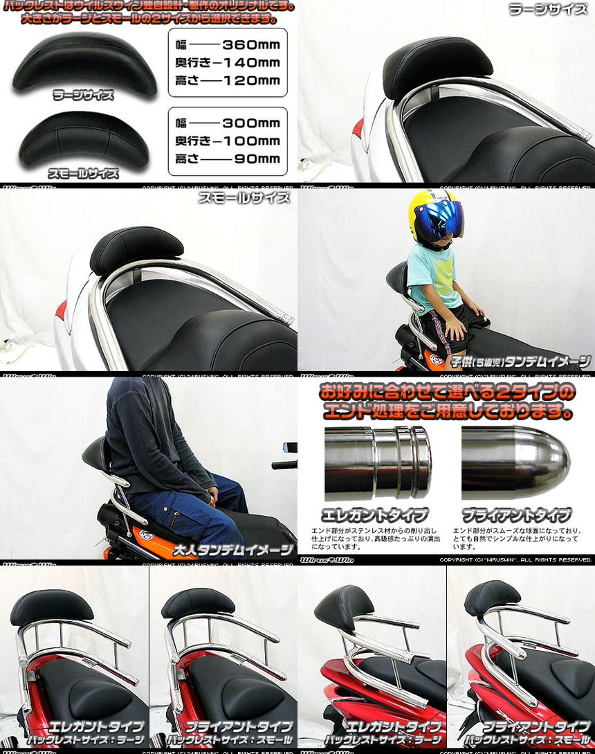 ■受注生産商品となっており、商品手配後 2週間程度入荷にお時間を頂きます。■安心して安全にタンデム走行をしていただけるよう、機能面を重視した商品です。子供から大人までしっかりとタンデムを快適にサポートします。●急発進時、横揺れ時、ブレーキング時の転落を防止します。子供、大人をタンデムしてのテスト走行を繰り返し開発した専用特別設計で、パッセンジャーをしっかりサポートしてくれるパーツです。●画像は5歳の子供を乗せた例です。子供も安心してタンデムできます。大人の男性を乗せた例です。もちろん大人も安心してタンデムできます。●パッセンジャーの快適性向上のため、大型バックレストを標準装備しております。表面素材にはノーマルシートと似たシート生地を使用していますので、取って付けた感じは無くとてもマッチします。●オリジナルバックレストは型から興して製作していますので、見た目も良く耐久性に優れるしっかりとした作りになっています。●ラージサイズとスモールサイズの2サイズをご用意しておりますので、お好みに応じて選択して頂けます。(装着画像のバックレストはラージサイズです。)●取り付けには、簡単な穴開け加工が必要になります。●純正リアスポイラーのABS素材への穴開け加工をして頂きます。●シート下の隠れる場所ですので、タンデムバーを取り外しても全く目立ちません。穴開けの位置もとても分かりやすい場所ですので位置を計ったりの面倒な作業は全く必要ありません。●簡単な取付説明書も付属しております。材質は、耐久性、耐食性の高いステンレスを使用しています。オールステンレス製です。●仕上げはバフ掛けを施していますので、高級感タップリでドレスアップにも最適の逸品です!●バーが極太なので、パッセンジャーが握りやすく力を入れやすいので、安全性も高くなっております。●お好みに応じてバーエンドの形状を、エレガントタイプとブライアントタイプの2種類から選択して頂けます。