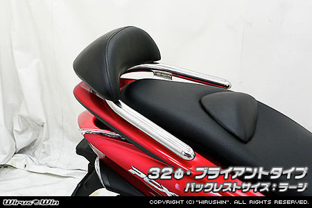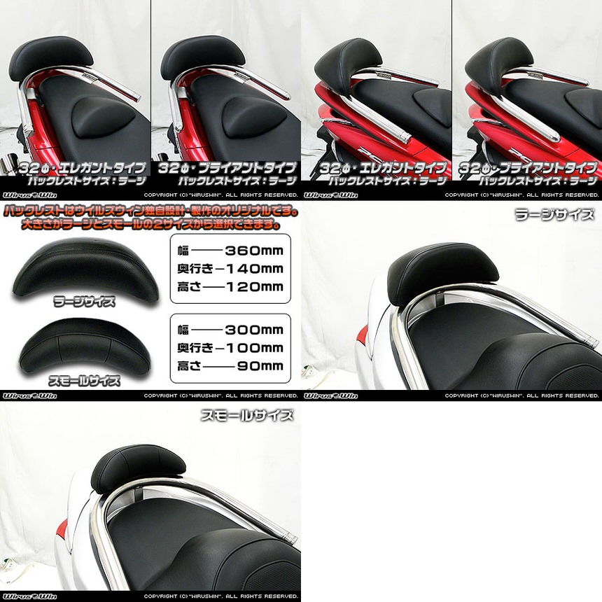 ■受注生産商品となっており、商品手配後 2週間程度入荷にお時間を頂きます。■今、ローダウンはスクーターカスタムの定番となっておりますが、そのローフォルムに合わせて出来るだけ車体全体を低く見せるために、車体との一体感を追求したタンデムバーを開発いたしました!●車体に沿うように低くデザインされているのでボディラインにフィットし、かつ極太の32mm径のステンレスパイプを採用しましたので、存在感、目立ち度は抜群です!仕上げはバフ掛けを施していますので、高級感タップリでドレスアップには最適の逸品です!●バーが極太なので、パッセンジャーが握りやすく力を入れやすいので、安全性も高くなっております。●ユーザー様により便利でお手軽に装着して頂くため、大型バックレストをウイルズウィンオリジナルで製作しました。従来の価格より大幅に値下げする事に成功しましたので、よりお求めやすくなりました。●オリジナルバックレストは型から興して製作していますので、見た目も良く耐久性に優れるしっかりとした作りになっています。●ラージサイズとスモールサイズの2サイズをご用意しておりますので、お好みに応じて選択して頂けます。●純正リアスポイラーのABS素材への穴開け加工をして頂きます。●シート下の隠れる場所ですので、タンデムバーを取り外しても全く目立ちません。穴開けの位置もとても分かりやすい場所ですので位置を計ったりの面倒な作業は全く必要ありません。●簡単な取付説明書も付属しております。●材質は、耐久性、耐食性の高いステンレスを使用しています。オールステンレス製です。●仕上げはバフ掛けを施していますので、高級感タップリでドレスアップにも最適の逸品です!●お好みに応じてバーエンドの形状を、エレガントタイプとブライアントタイプの2種類から選択して頂けます。