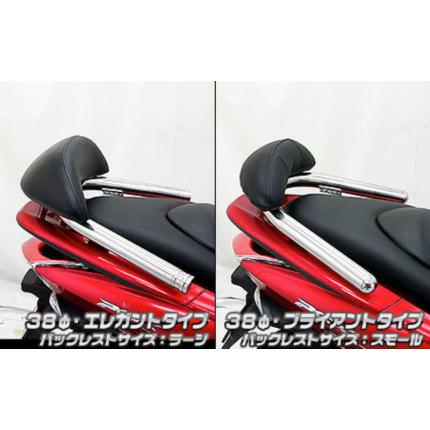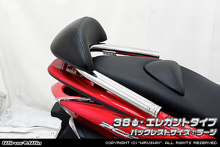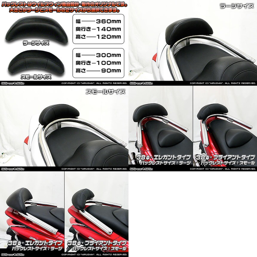 ■受注生産商品となっており、商品手配後 2週間程度入荷にお時間を頂きます。■今、ローダウンはスクーターカスタムの定番となっておりますが、そのローフォルムに合わせて出来るだけ車体全体を低く見せるために、車体との一体感を追求したタンデムバーを開発いたしました!●車体に沿うように低くデザインされているのでボディラインにフィットし、かつ極太の32mm径のステンレスパイプを採用しましたので、存在感、目立ち度は抜群です!仕上げはバフ掛けを施していますので、高級感タップリでドレスアップには最適の逸品です!●バーが極太なので、パッセンジャーが握りやすく力を入れやすいので、安全性も高くなっております。●ユーザー様により便利でお手軽に装着して頂くため、大型バックレストをウイルズウィンオリジナルで製作しました。従来の価格より大幅に値下げする事に成功しましたので、よりお求めやすくなりました。●オリジナルバックレストは型から興して製作していますので、見た目も良く耐久性に優れるしっかりとした作りになっています。●ラージサイズとスモールサイズの2サイズをご用意しておりますので、お好みに応じて選択して頂けます。●純正リアスポイラーのABS素材への穴開け加工をして頂きます。●シート下の隠れる場所ですので、タンデムバーを取り外しても全く目立ちません。穴開けの位置もとても分かりやすい場所ですので位置を計ったりの面倒な作業は全く必要ありません。●簡単な取付説明書も付属しております。●材質は、耐久性、耐食性の高いステンレスを使用しています。オールステンレス製です。●仕上げはバフ掛けを施していますので、高級感タップリでドレスアップにも最適の逸品です!●お好みに応じてバーエンドの形状を、エレガントタイプとブライアントタイプの2種類から選択して頂けます。