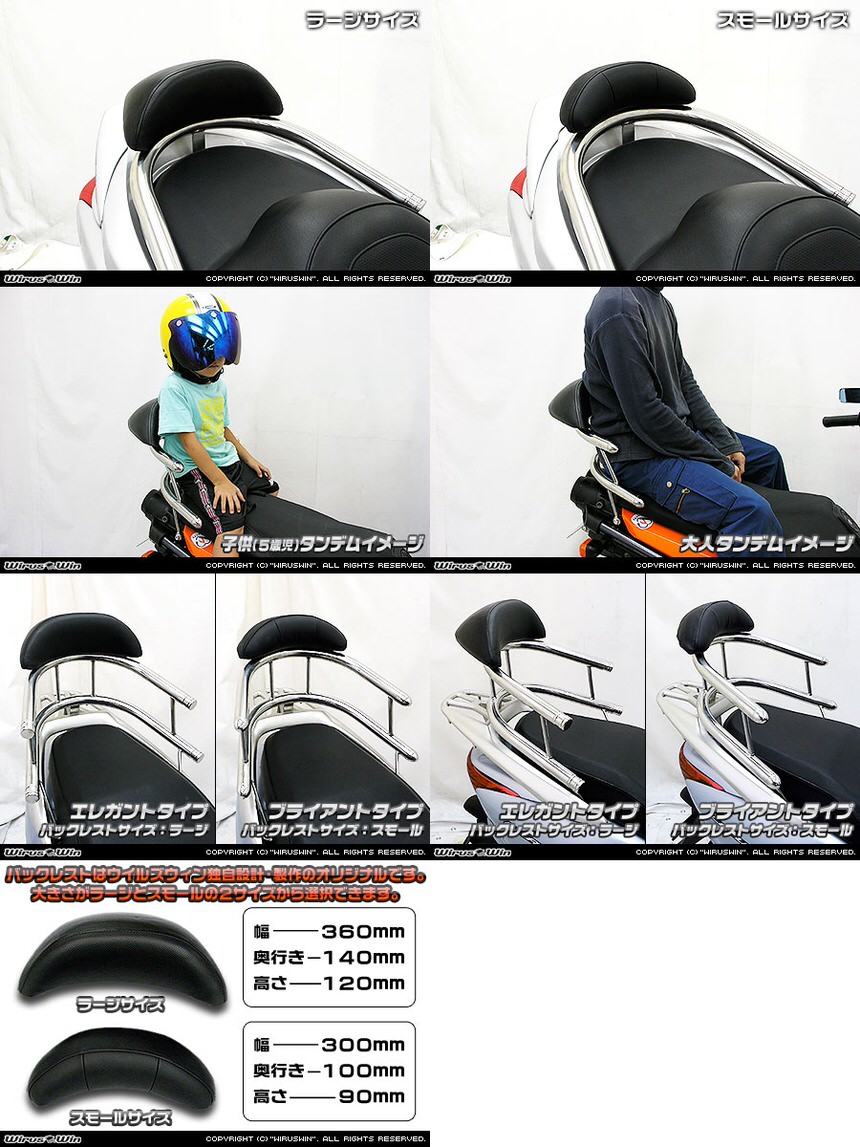 ■受注生産商品となっており、商品手配後 2週間程度入荷にお時間を頂きます。■安心して安全にタンデム走行をしていただけるよう、機能面を重視した商品です。子供から大人までしっかりとタンデムを快適にサポートします。●急発進時、横揺れ時、ブレーキング時の転落を防止します。子供、大人をタンデムしてのテスト走行を繰り返し開発した専用特別設計で、パッセンジャーをしっかりサポートしてくれるパーツです。●画像は5歳の子供を乗せた例です。子供も安心してタンデムできます。大人の男性を乗せた例です。もちろん大人も安心してタンデムできます。●パッセンジャーの快適性向上のため、大型バックレストを標準装備しております。表面素材にはノーマルシートと似たシート生地を使用していますので、取って付けた感じは無くとてもマッチします。●オリジナルバックレストは型から興して製作していますので、見た目も良く耐久性に優れるしっかりとした作りになっています。●ラージサイズとスモールサイズの2サイズをご用意しておりますので、お好みに応じて選択して頂けます。(装着画像のバックレストはラージサイズです。)●取り付けには、簡単な穴開け加工が必要になります。●純正リアスポイラーのABS素材への穴開け加工をして頂きます。●シート下の隠れる場所ですので、タンデムバーを取り外しても全く目立ちません。穴開けの位置もとても分かりやすい場所ですので位置を計ったりの面倒な作業は全く必要ありません。●簡単な取付説明書も付属しております。材質は、耐久性、耐食性の高いステンレスを使用しています。オールステンレス製です。●仕上げはバフ掛けを施していますので、高級感タップリでドレスアップにも最適の逸品です!●バーが極太なので、パッセンジャーが握りやすく力を入れやすいので、安全性も高くなっております。●お好みに応じてバーエンドの形状を、エレガントタイプとブライアントタイプの2種類から選択して頂けます。