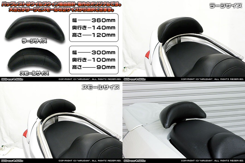 ■受注生産商品となっており、商品手配後 2週間程度入荷にお時間を頂きます。■マグザム用バックレストKitです。ノーマルの四角いバックレストも装着できるよう製作していますので、お好みで付け換える事ができます。タンデムバーレスにしてすっきりさせたい方にはお勧めな商品です。他社メーカーに比べ大型のバックレストを使用していますので、パッセンジャーを快適かつ安全にサポートしてくれます。オリジナルバックレストは型から興して製作していますので、見た目も良く耐久性に優れたしっかりとした作りになっています。表面素材にはノーマルシートと似たシート生地を使用していますので、取って付けて感じは無くとても自然にマッチします。装着はバックレスト専用ステーをボルト2本で固定するだけですので、比較的簡単に取り付けできます。ステーの材質は耐久性、耐食性の高いステンレス製です。ウイルズウィンステッカーも付いています。シンプルにカスタムしたい方、低予算でタンデム強化したい方などに特にお勧めです。