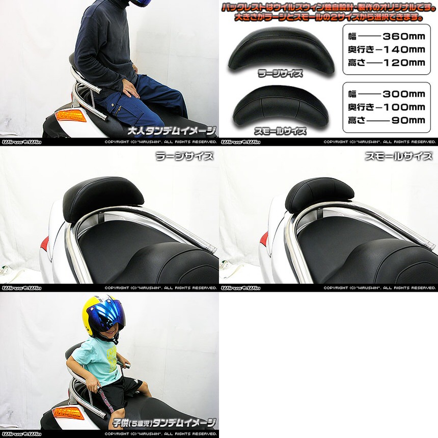 ■受注生産商品となっており、商品手配後 2週間程度入荷にお時間を頂きます。■安心して安全にタンデム走行をしていただけるよう、機能面を重視した商品です。子供から大人までしっかりとタンデムを快適にサポートします。急発進時、横揺れ時、ブレーキング時の転落を防止します。子供、大人をタンデムしてのテスト走行を繰り返し開発した専用特別設計で、パッセンジャーをしっかりサポートしてくれるパーツです。パッセンジャーの快適性向上のため、大型バックレストを標準装備しております。表面素材にはノーマルシートと似たシート生地を使用していますので、取って付けた感じは無くとてもマッチします。オリジナルバックレストは型から興して製作していますので、見た目も良く耐久性に優れたしっかりとした作りになっています。ラージサイズとスモールサイズの2サイズをご用意しておりますので、お好みに応じて選択して頂けます。取り付けは、簡単に無加工でしっかりとボルトオンで固定できます。材質は、耐久性、耐食性の高いステンレスを使用しています。オールステンレス製です。仕上げはバフ掛けを施していますので、高級感タップリでドレスアップにも最適の逸品です!バーが極太なので、パッセンジャーが握りやすく力を入れやすいので、安全性も高くなっております。