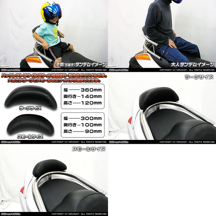 ■受注生産商品となっており、商品手配後 2週間程度入荷にお時間を頂きます。■安心して安全にタンデム走行をしていただけるよう、機能面を重視した商品です。子供から大人までしっかりとタンデムを快適にサポートします。急発進時、横揺れ時、ブレーキング時の転落を防止します。子供、大人をタンデムしてのテスト走行を繰り返し開発した専用特別設計で、パッセンジャーをしっかりサポートしてくれるパーツです。パッセンジャーの快適性向上のため、大型バックレストを標準装備しております。表面素材にはノーマルシートと似たシート生地を使用していますので、取って付けた感じは無くとてもマッチします。オリジナルバックレストは型から興して製作していますので、見た目も良く耐久性に優れたしっかりとした作りになっています。ラージサイズとスモールサイズの2サイズをご用意しておりますので、お好みに応じて選択して頂けます。取り付けは、簡単に無加工でしっかりとボルトオンで固定できます。材質は、耐久性、耐食性の高いステンレスを使用しています。オールステンレス製です。仕上げはバフ掛けを施していますので、高級感タップリでドレスアップにも最適の逸品です!バーが極太なので、パッセンジャーが握りやすく力を入れやすいので、安全性も高くなっております。