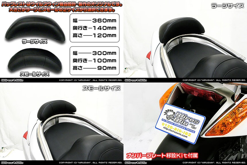 ■受注生産商品となっており、商品手配後 2週間程度入荷にお時間を頂きます。■今、ローダウンはスクーターカスタムの定番となっておりますが、そのローフォルムに合わせて出来るだけ車体全体を低く見せるために、車体との一体感を追求したタンデムバーを開発いたしました!車体に沿うように低くデザインされているのでボディラインにフィットし、かつ極太の32mm径のステンレスパイプを採用しましたので、存在感、目立ち度は抜群です!仕上げはバフ掛けを施していますので、高級感タップリでドレスアップには最適の逸品です!バーが極太なので、パッセンジャーが握りやすく力を入れやすいので、安全性も高くなっております。また、ユーザー様によりお手軽に装着して頂くため、大型バックレストをウイルズウィンオリジナルで製作しました。従来の価格より大幅に値下げする事に成功しましたので、よりお求めやすくなりました。オリジナルバックレストは型から興して製作していますので、見た目も良く耐久性に優れるしっかりとした作りになっています。ノーマルバックレストに装備されているナンバープレートをテールランプ下側に移動させるためのKitが付属しておりますので、追加工など必要なく装着して頂けます。