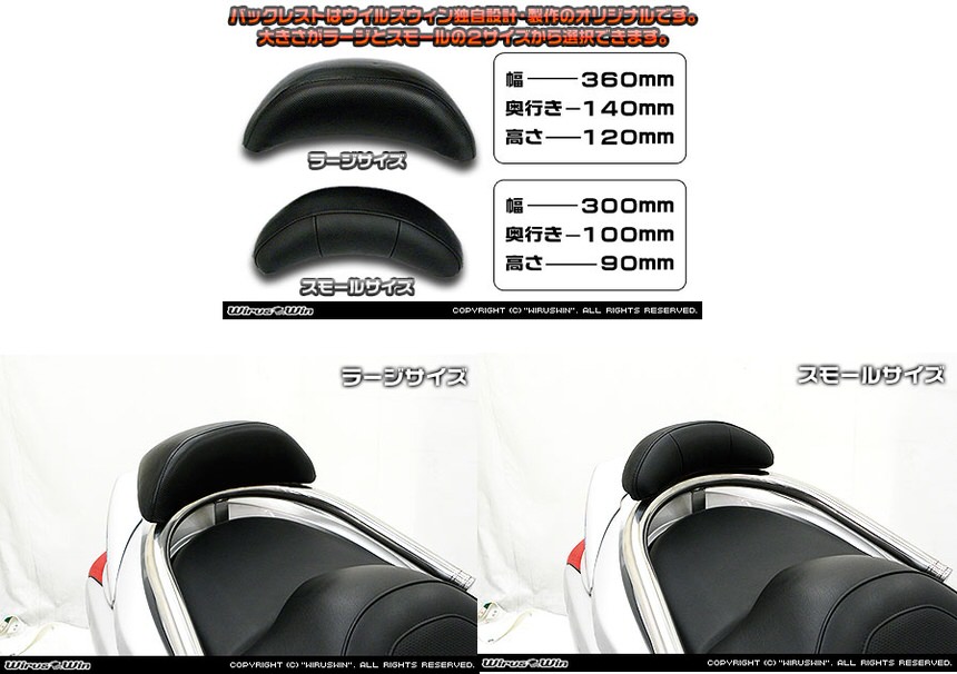 ■受注生産商品となっており、商品手配後 2週間程度入荷にお時間を頂きます。■今、ローダウンはスクーターカスタムの定番となっておりますが、そのローフォルムに合わせて出来るだけ車体全体を低く見せるために、車体との一体感を追求したタンデムバーを開発いたしました!●車体に沿うように低くデザインされているのでボディラインにフィットし、かつ極太の32mm径のステンレスパイプを採用しましたので、存在感、目立ち度は抜群です!仕上げはバフ掛けを施していますので、高級感タップリでドレスアップには最適の逸品です!●バーが極太なので、パッセンジャーが握りやすく力を入れやすいので、安全性も高くなっております。●ユーザー様により便利でお手軽に装着して頂くため、大型バックレストをウイルズウィンオリジナルで製作しました。従来の価格より大幅に値下げする事に成功しましたので、よりお求めやすくなりました。●オリジナルバックレストは型から興して製作していますので、見た目も良く耐久性に優れるしっかりとした作りになっています。●ラージサイズとスモールサイズの2サイズをご用意しておりますので、お好みに応じて選択して頂けます。●お好みに応じてバーエンドの形状を、エレガントタイプとブライアントタイプの2種類から選択して頂けます。●バーの太さは32mm径と38mm径の2種類から選択して頂けます。