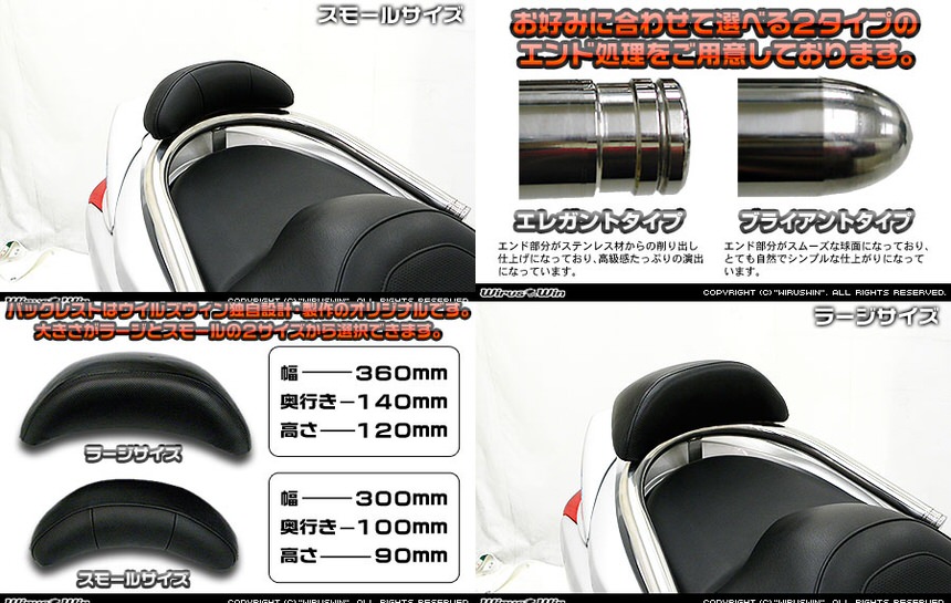 ■受注生産商品となっており、商品手配後 2週間程度入荷にお時間を頂きます。■出来るだけ車体全体を低く見せるために、車体との一体感を追求したタンデムバーを開発いたしました!●車体に沿うように低くデザインされているのでボディラインにフィットし、かつ極太の32mm径のステンレスパイプを採用しましたので、存在感、目立ち度は抜群です!仕上げはバフ掛けを施していますので、高級感タップリでドレスアップには最適の逸品です!●バーが極太なので、パッセンジャーが握りやすく力を入れやすいので、安全性も高くなっております。●ユーザー様により便利でお手軽に装着して頂くため、大型バックレストをウイルズウィンオリジナルで製作しました。従来の価格より大幅に値下げする事に成功しましたので、よりお求めやすくなりました。●オリジナルバックレストは型から興して製作していますので、見た目も良く耐久性に優れるしっかりとした作りになっています。●ラージサイズとスモールサイズの2サイズをご用意しておりますので、お好みに応じて選択して頂けます。(装着画像のバックレストはスモールサイズです。)●お好みに応じてバーエンドの形状を、エレガントタイプとブライアントタイプの2種類から選択して頂けます。WirusWinステッカー、WirusWinプレート付属。